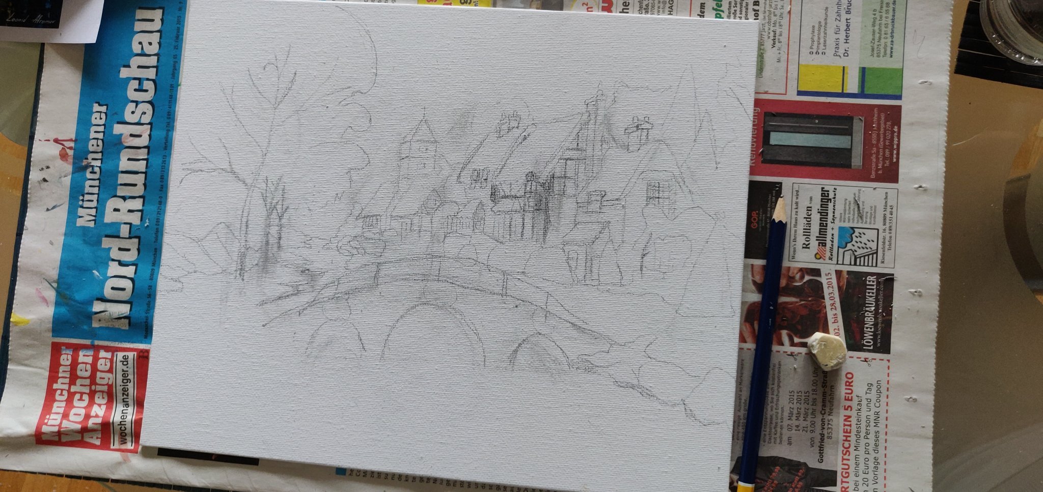 Един от подаръците ми ще е това, зимна картина за баба. В процес е още, много начална фаза. Ползвам 4-те почивни дни в Ю. Германия да се вихря. 😃