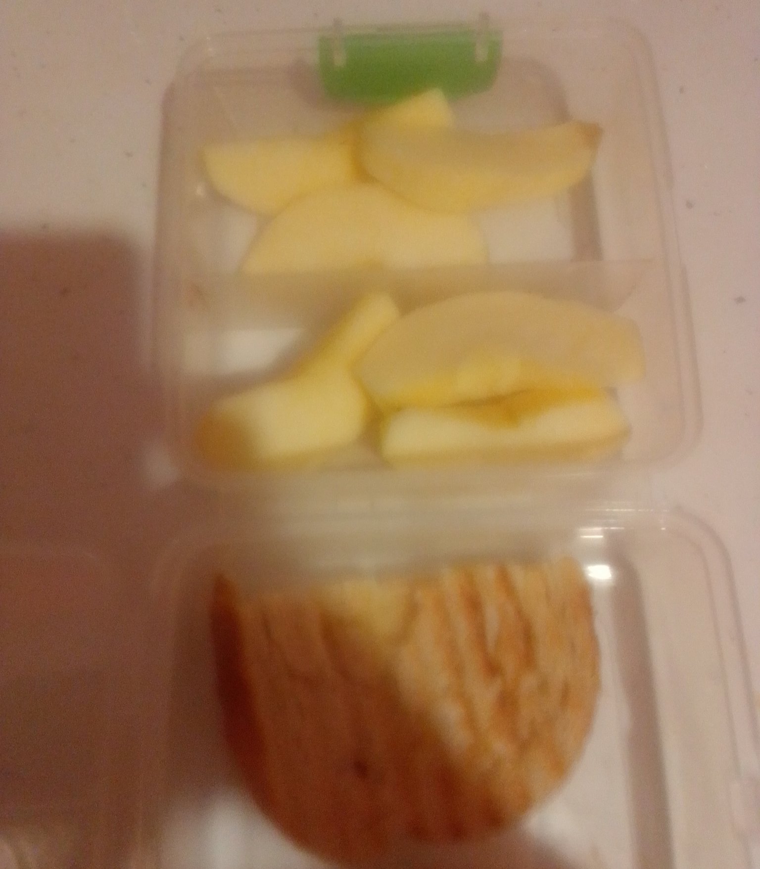 Голямата кака има кисело мляко с домашно мюсли за закуска. За обяд си взе от вчерашните бутерки и към тях телешки бургер и маслини. За следобедна закуска има ябълка.
