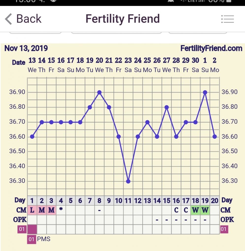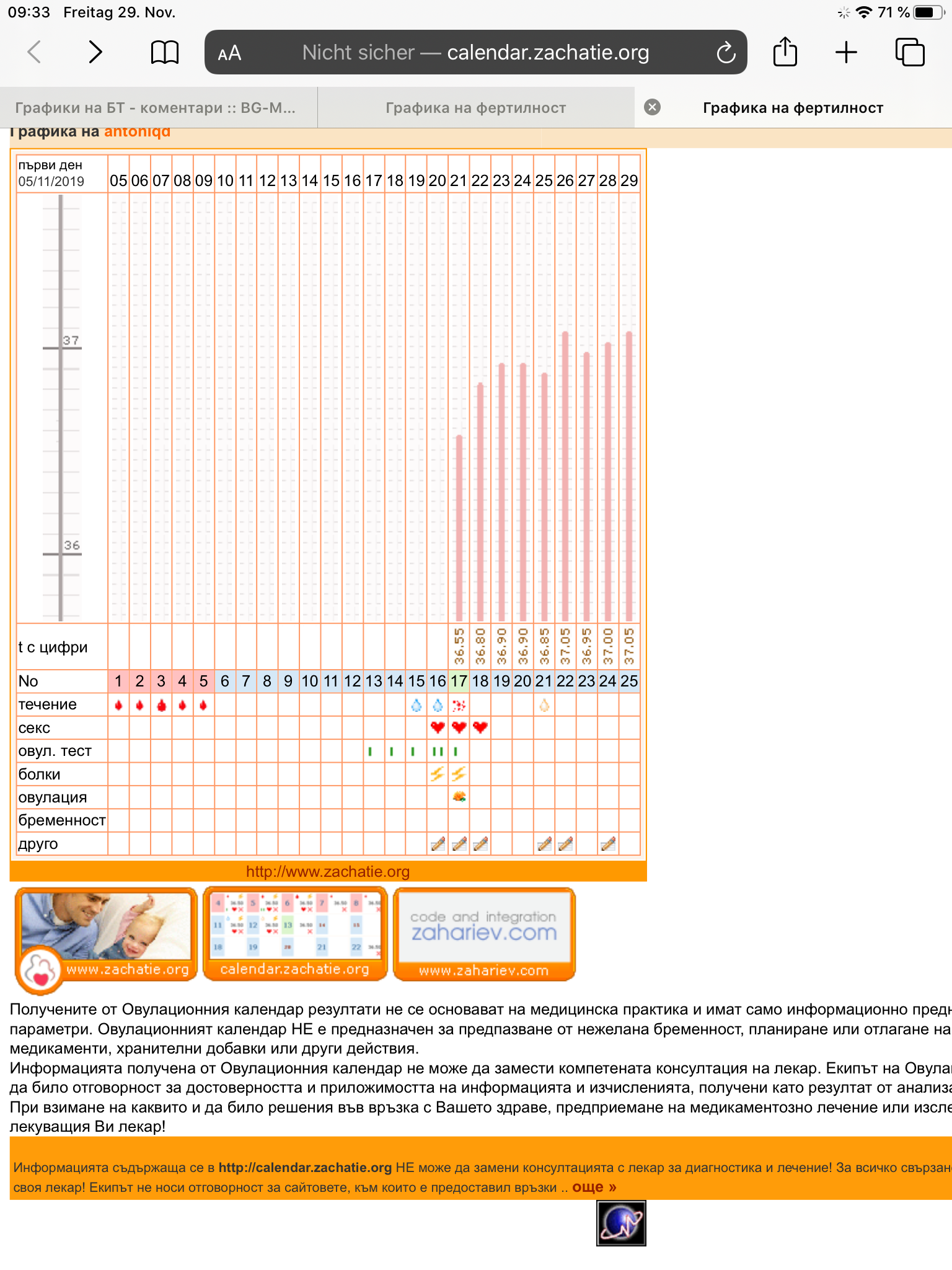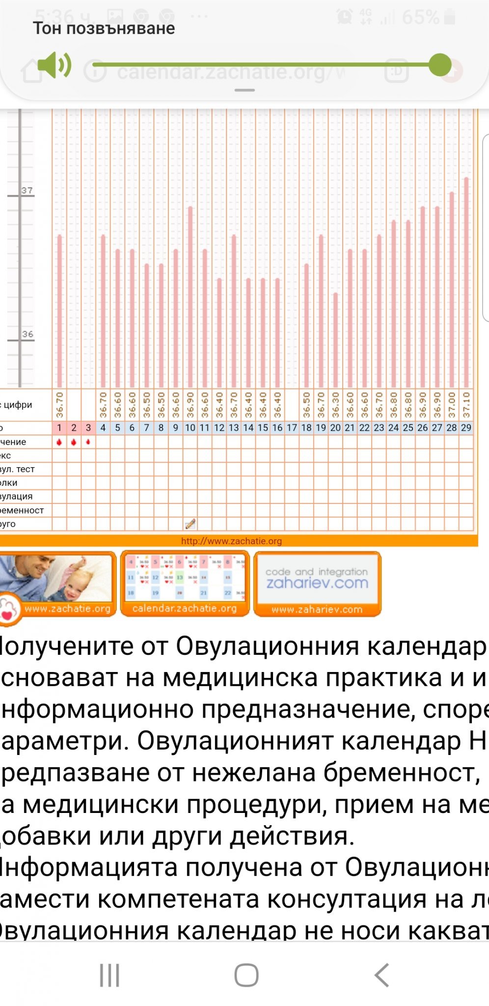 Здравейте момичета с мъжа ми правим опити за второ от 6 месеца до сега засичах ОВУ само с тестове но понеже не се получава реших този месец да почна и БТ да следя знам че не съм започнала от началото на цикала и това би било проблем в разчитането на графиката но бих помолила да ми кажете според вас как върви до тук меря БТ всяка сутрин още докато се събудя между 7.00 7.30 ректално с термометър за проследяване на БТ. Положителен ОВУ тест имах на 16.11 както и болки в левия яйчник на 17.11 болките станаха доста по силни имах и съвсем леко зацапвате което ме кара да мисля че ову е била тогава. Но нещо ми се Струва че БТ е ниска вие как мислите? Благодаря предварително http://calendar.zachatie.org/work/OpenGraphicCycles?grCycle=-1