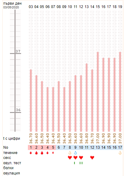 Здравейте от мен, за втори пореден месец меря БТ като миналия имах БХ. Този месец явно всичко се е разбутало и тотално се обърках. Обикновено цикълът ми е 29-30 дни с овулация между 15-17ти ден. Да ама сега след БХ вече имам 4 положителни поредни теста за овулация и то много силно положителни. В същото време по графика излиза , че О е минала между 11-12 ден. Правя уточнение, че на 12ти ден не успях да премеря БТ, но предполагам е била подобна на тази на 11ти. Нямам ПКЯ. Имам завишено тсх , което бях свалила на 1.18 и днес е 2.54, явно заради БХ. Миналия месец имах много ясна графика и температура 37-37.1 след О. Сега 36.91-2. , а днес 37.02 най-накрая се вдигна малко.Моля за съвет Simple Smile