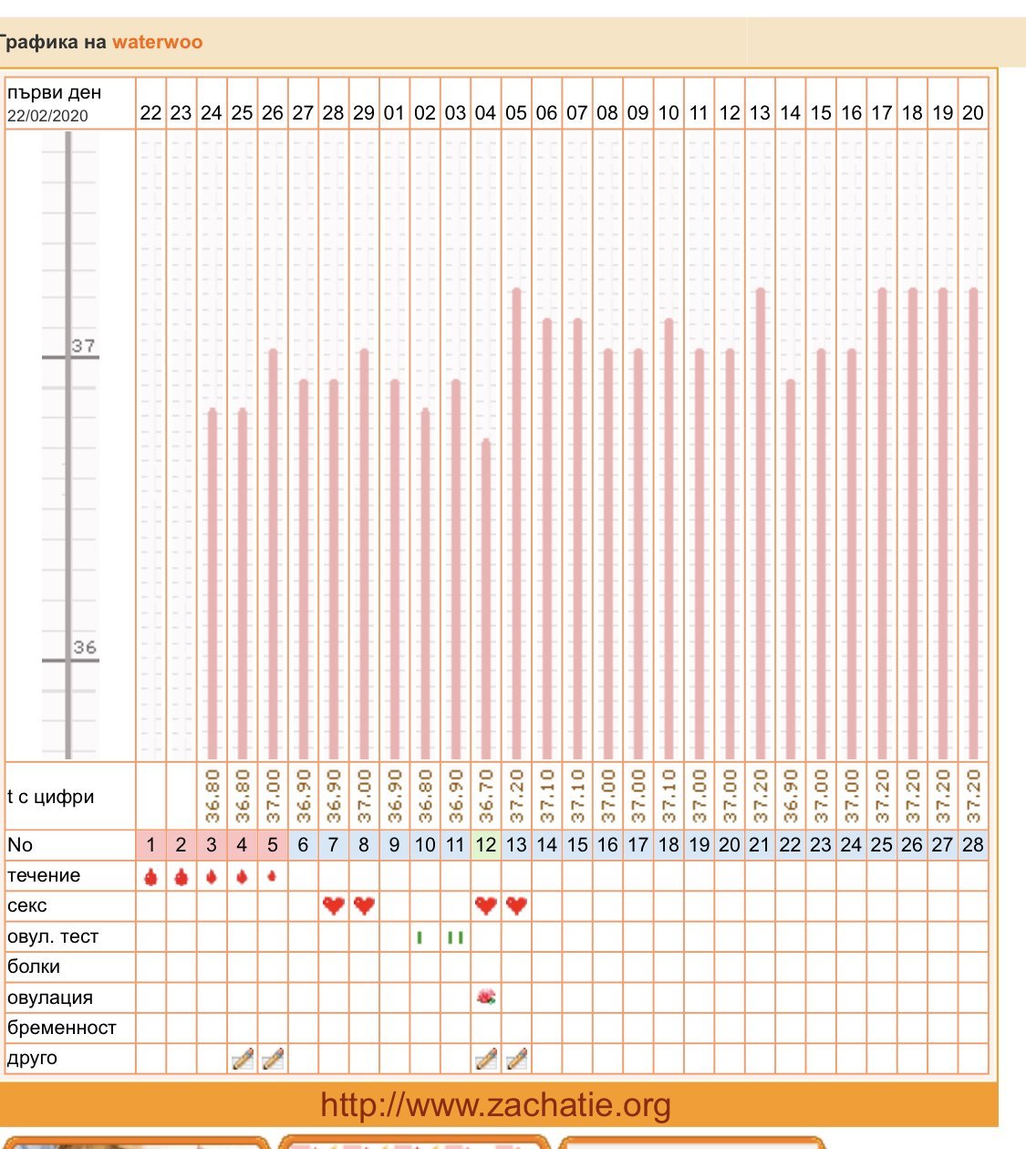 Здравейте, за първи път откакто меря температура (7 месеца) имам двуфазност в графиката, макар и колеблива. За първи път имах и положителен тест за овулация. С почти изчерпан яйчников резерв съм, на 38г. Имах някаква надежда, като видях в графиката, че този месец вероятно е имало О. Днес температурата падна. Значи ли това да отписвам месеца? Меря анално с дигитален термометър сутрин в 6.30-7.00 Thinking
