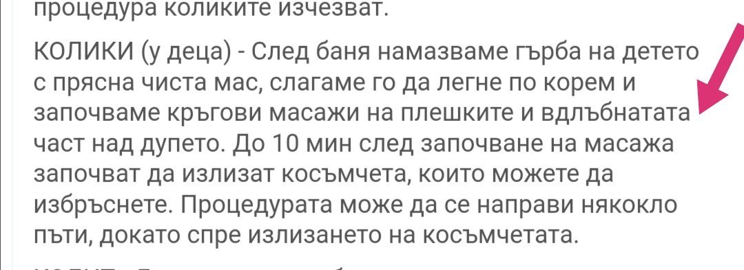Моето дете не мога да кажа, че има силни колики, аз рев с часове не съм имала никога до сега, винаги й намираме цаката как да е спокойна, но и според мен просто децата се успокояват от масажа. Ванга може би е имала точно това напредвид Wink - щом помага не виждам лошо.