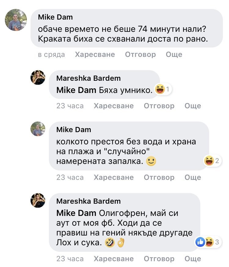 А Марешка е невъзпитана - трябвало е просто да го блокира (аз блокирам всеки, който ме дразни в Инстаграм, Туитър и Фб и ми е идеално) . Но й вярвам, че са висели по един час - чак пък и за това да лъжат?