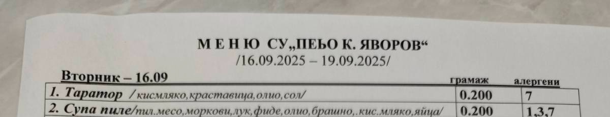 Менюто в стола на новото училище на децата ми. След Дерйа в едно риалити е време и за Пеьо. Ако Ботьов поради липса на БАН по негово време се е подписвал като Ботйов, за Яворов съм почти сигурна, че не е.