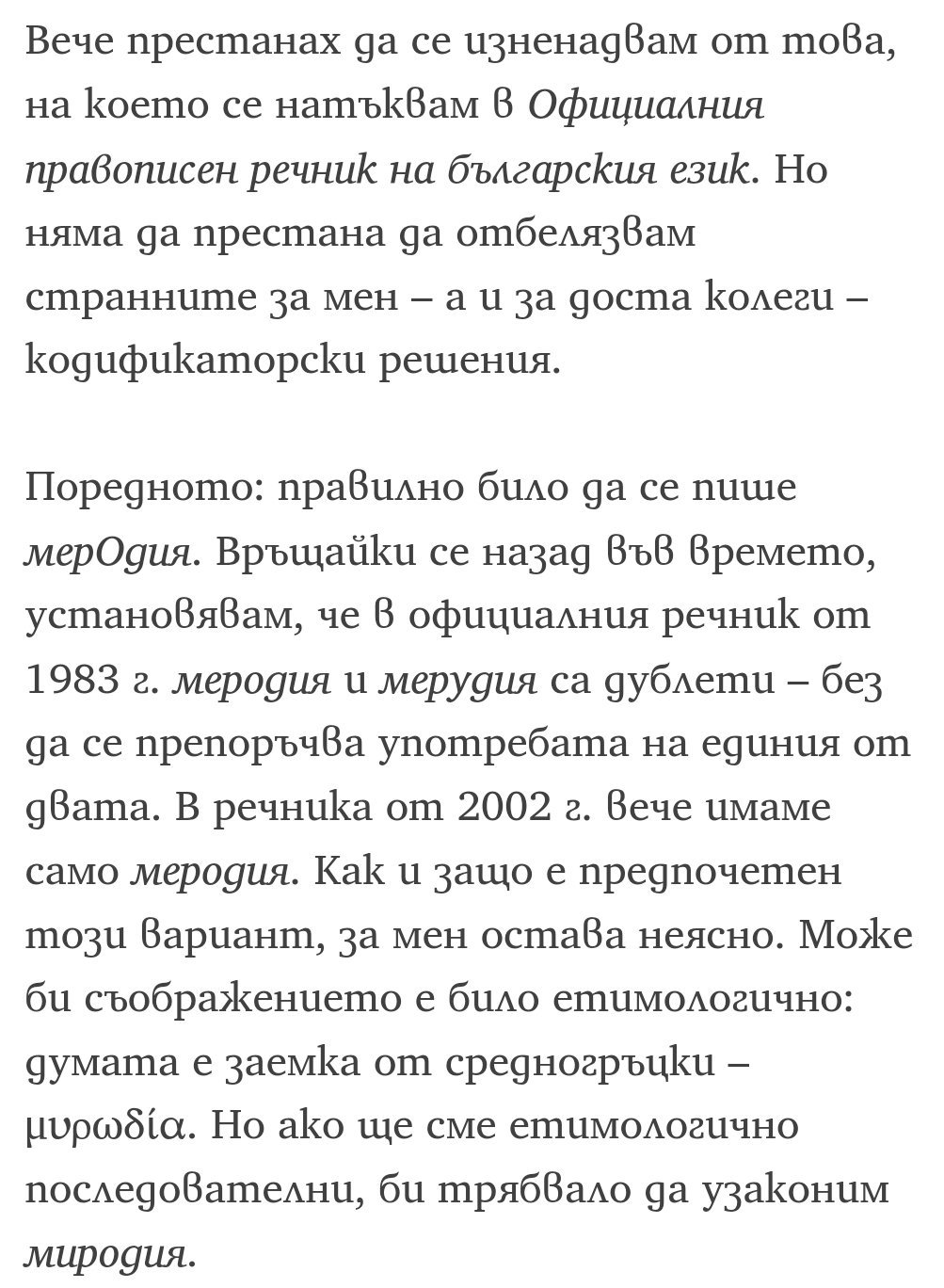 Били са дублети в речника от 1983 г., след което е останала само "мерОдия", макар че по-популярното изписване е "мерУдия". Ето повече от Павлина: