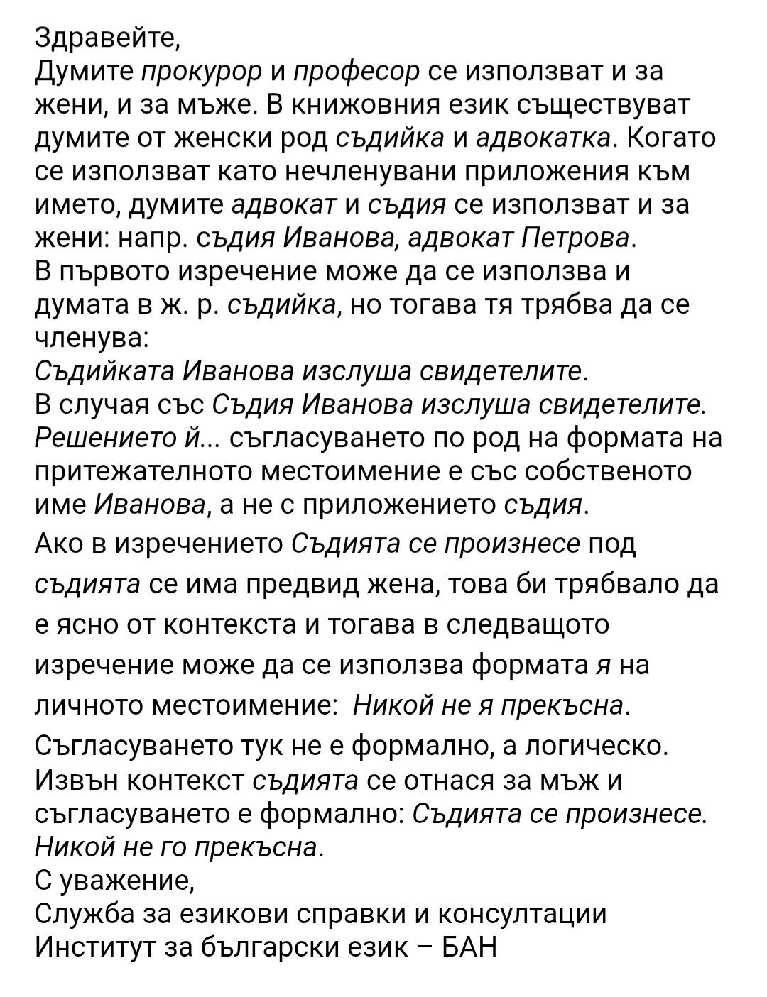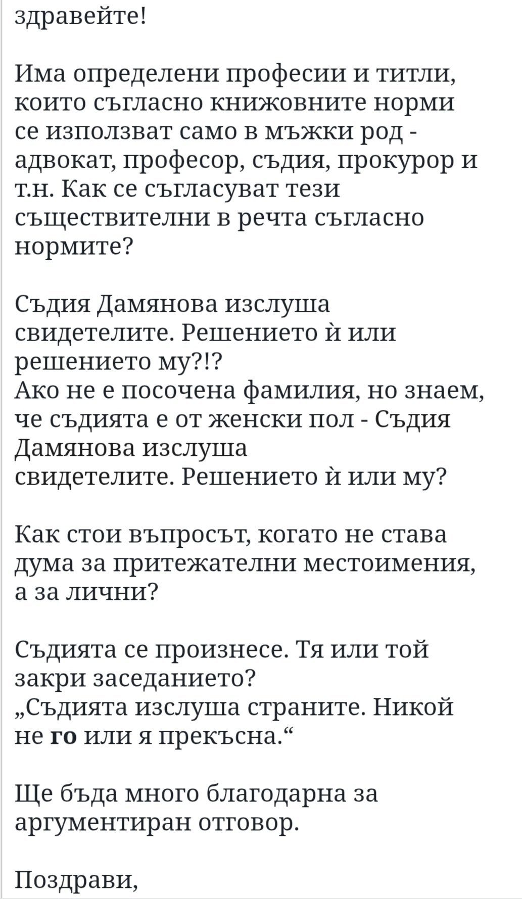 *Уточнявам, понеже май не се разбира съвсем какво съм искала да кажа: езиковите ми настройки не се бунтуват срещу изречение от типа "съдия Дамянова е постановила решение". Бунтуват се срещу "съдията е постановила решение". И аналогично за другите. Съдия, доктор и т.н. + женско име го схващам като едно съчетание от женски род; без име - от мъжки, дори за жени.