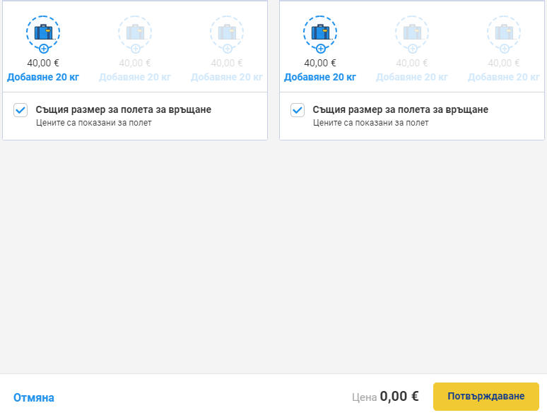 Под всяко име има опция Добавяне на 20 кг. Избирате тази под пътника, за който искате да добавите багаж.