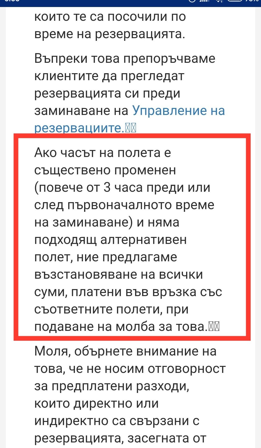 В моето съобщение за промяна пишеше, че връщат парите само ако промяната е с повече от 2ч. от първоначално обявеното време за излитане. Но те реално с няколко последователни промени под 2ч. и приемането на всяка поотделно от купувача биха могли да заобиколят това изискване. Аз се радвах именно, че часовете на полетите ми са нормални и предполагат спокойно придвижване на групата ни, но уви. Засега мисля да потвърдя след промяната, но ако дръпнат полета още по-рано ще е наистина много неприятно. Разместват се планове за придвижване, трябва да се уговаря по-ранно настаняване ако изобщо е възможно...А като си помисля, че има още време до полета и могат още промени да настъпват, ужас!