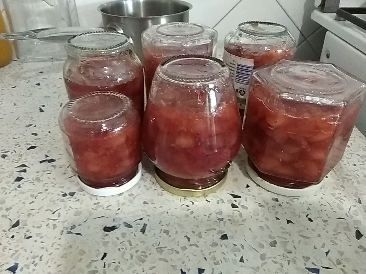 Ох, сега вече сложни въпроси ми задаваш! Simple Smile Пълня.....и аз не знам докъде, почти догоре. Но така, че като сложиш капачката, да не изхвърля смес, разбира се. Не знам,  чак сантиметър май няма, но има някакво разстояние, някое милиметърче и друго. Абе, както си си свикнала. Иначе, да варя и като извадя, захлупвам върху капачките, като изстинат бурканчетата, обръщам и прибирам в килера. Не мисля, че ще му разсипеш нещо,то няма какво.