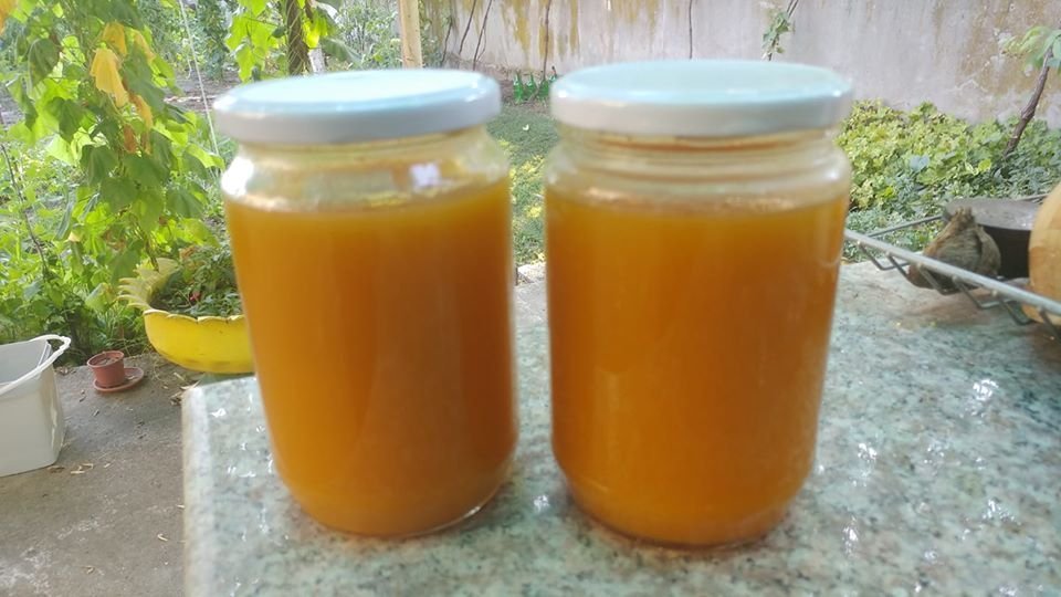 Направихме сок по рецептата на i_peych , но заменихме кайсиите с праскови- левият буркан на снимката. Резултата се одобри от мъжете и се прежалих и купих кайсии за нова доза- десният буркан.