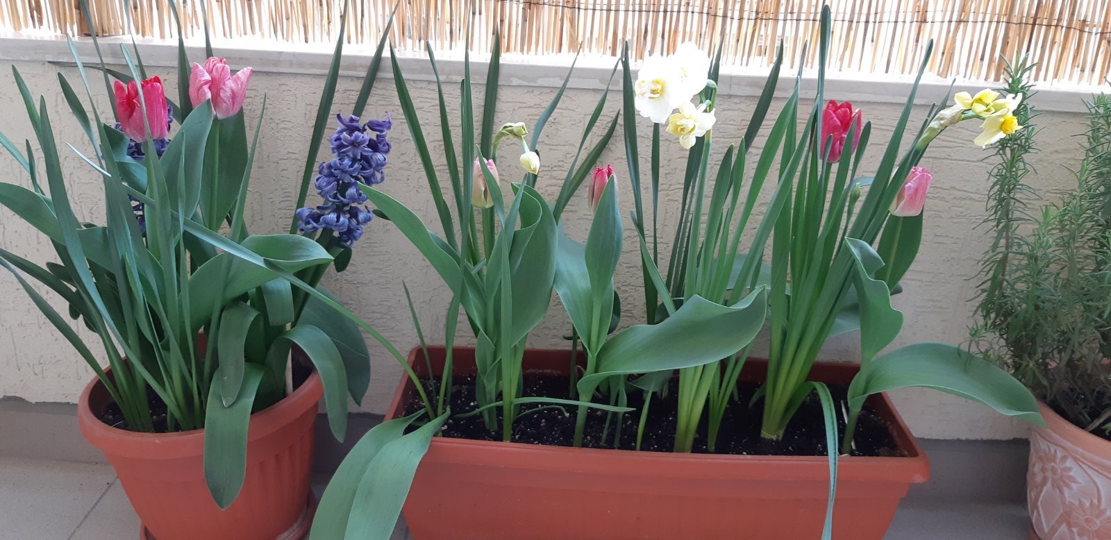 Луковиците ги засадих края на ноември, началото на декември. Мислех по-рано да ги сложа, но нали беше топло и не посмях. Поникнаха към февруари по някое време и от средата на март се виждаха, че ще има цветове.