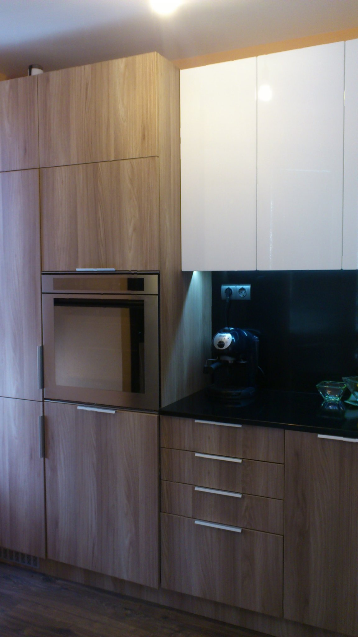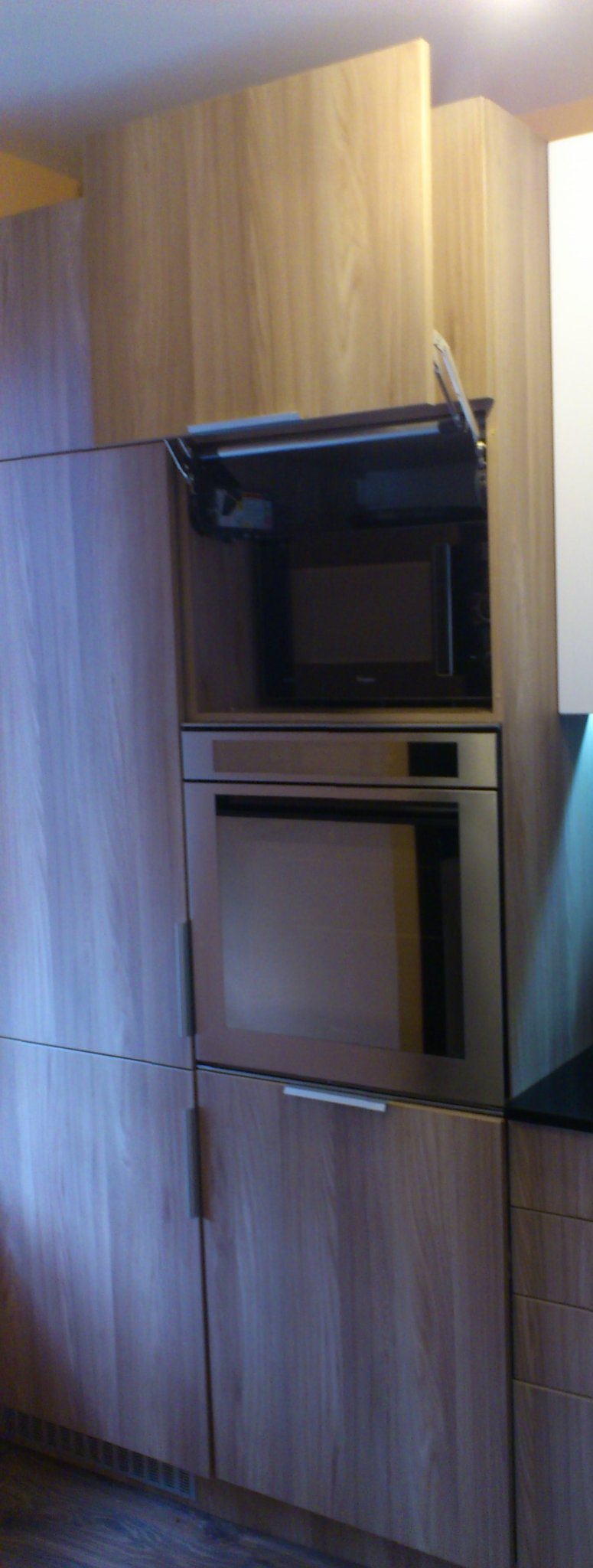 Ето една - под фурната е пералня, над нея MW в шкаф (размерът му се определи от височината на хладилника). Горните шкафове се отварят с пуш.