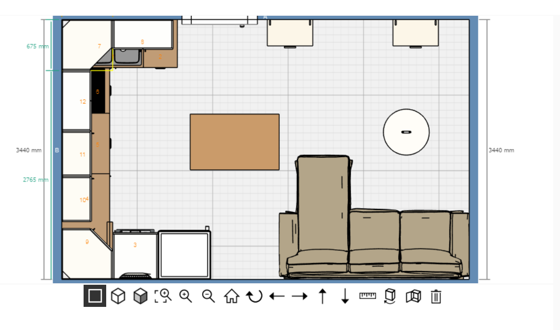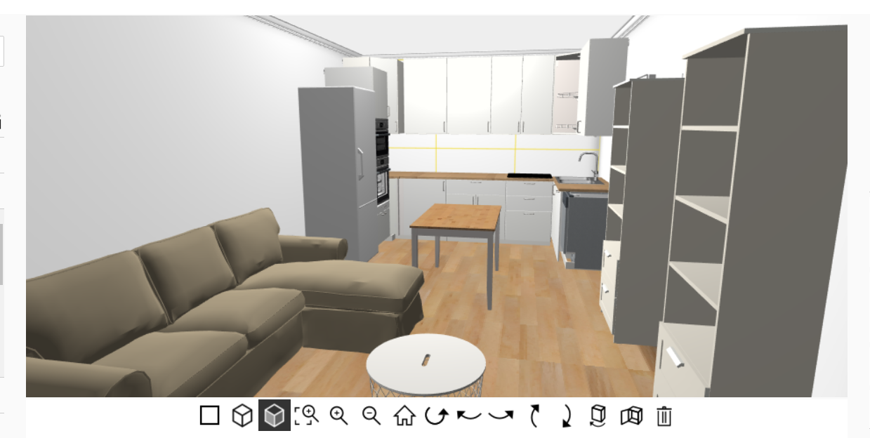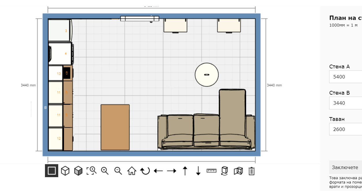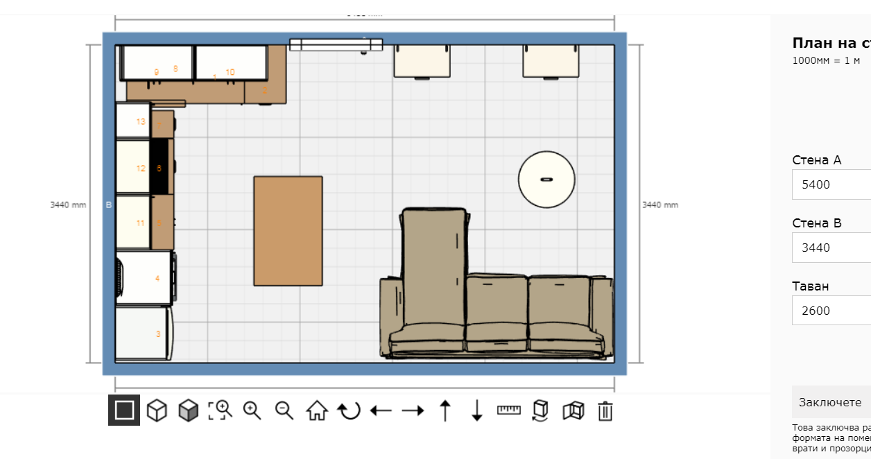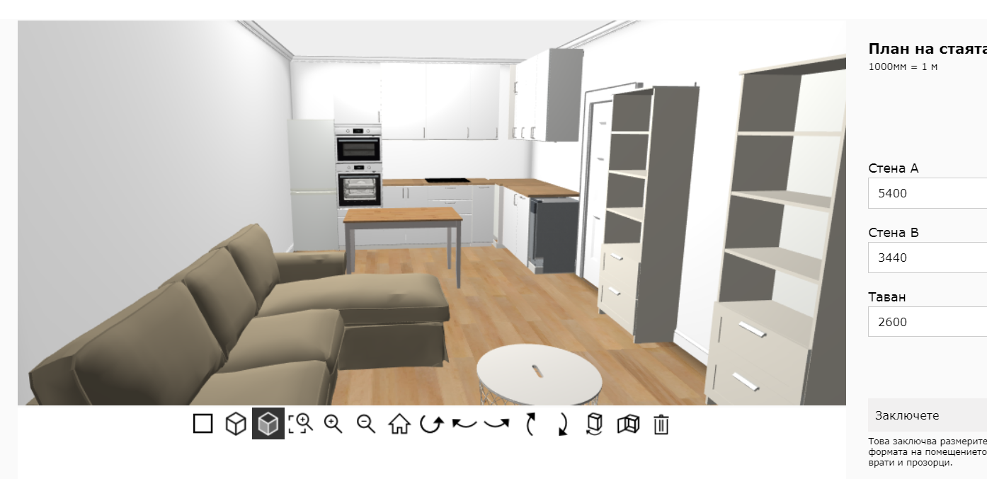 Предстои ми да направя кухня в хола и ще е холо-кухня.  Не съм хич добра, но предполагам, ще разберете какво съм сътворила с безплатната програма на Икеа.  На пъвите две снимки е "малка" кухня, мивката ще е най-вдясно /да 3 и 4 снимка се вижда къде ще бъде/ и дивана ще е с дясна "лежанка", но не намерих такава в програмата. Иска ми се да е "голямата" кухня, но се безпокоя, че няма да остане почти никакво място до масата. Готварския плот, все още го обмислям, дали да е двойка или четворка /повече от 2 котлона не ползвам/ и дали да са индукция или обикновен. В ъгъла между мивката и плота има комин, но ММ смята да го махне до някъде  /на първи етаж сме/ и да остави само колкото да може да се включи абсорбатора. Масата ми се иска да е разтегателна, нещо от сорта на 120/180 с ширина 70 или 80 см. Ние сме двама души, но когато се съберем с децата, сме 6-ма, че живот и здраве и повече. Grinning Разгледах цялата тема, ще имаме среща другата седмица с мебелист и ми се иска да имам някаква предварителна информация, дали проектите, които аз си изготвих са приложими или не. Размерите на помещението са 5400 мм. х 3400 мм.х2600 мм. От вратата до другата стена /там където ще са мивката и съдомиалнята/ е 1880 мм.