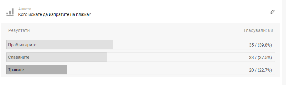 Бояна вместо да се оплаква колко и е студено носленцето, да беше копала... Unamused Славяните вече са ми доста по-симпатични от останалите племена, не очаквах. Георгиус млъкна, вече не ме дразни, само Бояна и Йоана да се разкарат и ще е чудно. От траките само близначките са ми симпатични и са супер във всички игри. От прабългарите може би Пламен и Роберта.