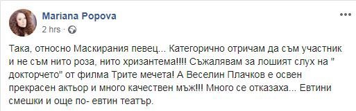 Хаха, Мариана Попова избухва във Фейсбук по повод изказването на Вергов в "Маскирания певец", че само Мариана Попова може да каже, че Веселин Плачков е великолепен актьор: