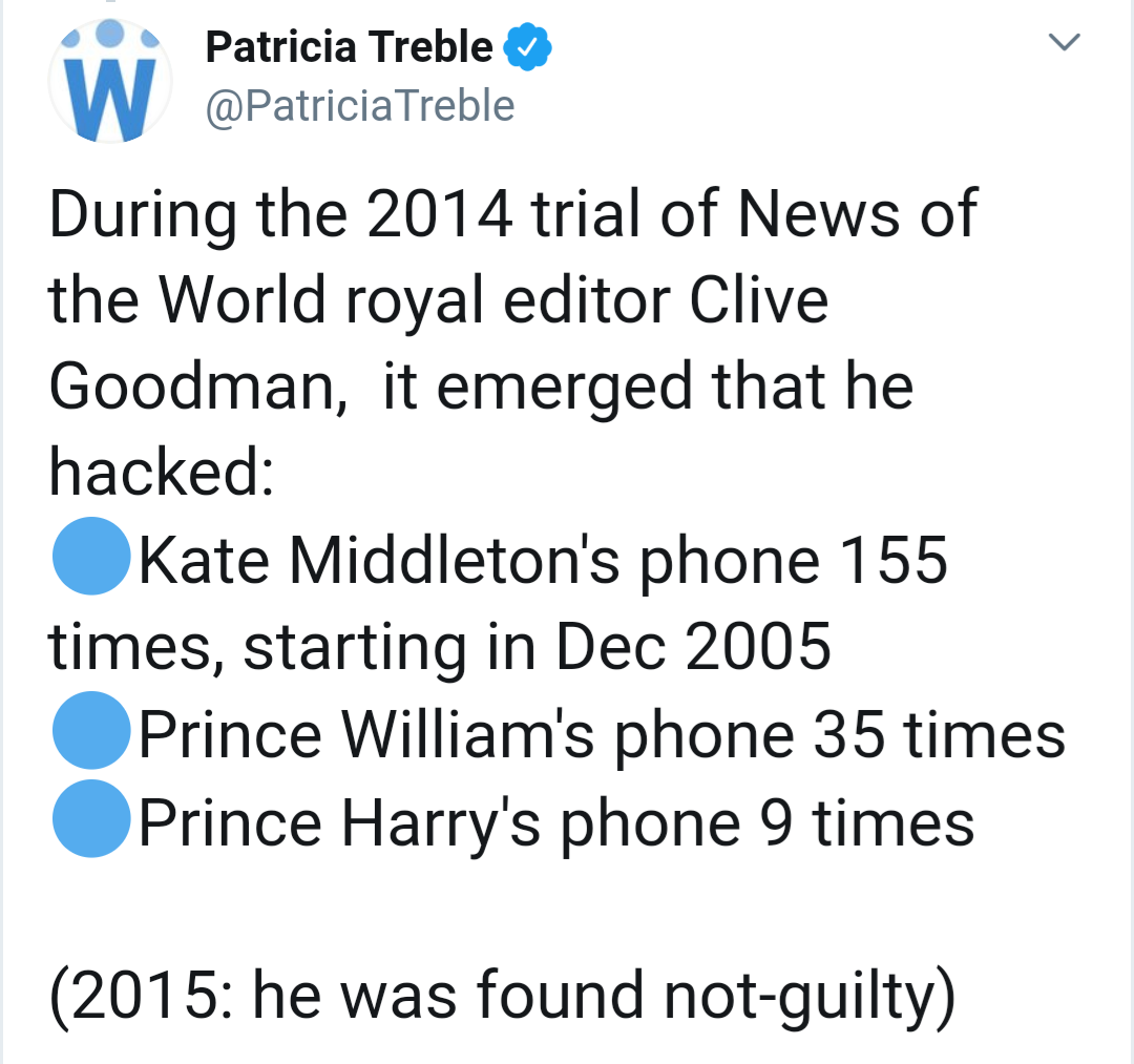 Съди Нюз Груп за хакване на гласовата поща. Не знам дали се е коментирало тук, но преди няколко години гръмна много голям скандал във Великобритания, защото се оказа, че от вестник "News of the world" са подслушвали много известни личности и са  публикували наученото. Сред подслушваните са били Хари, Уилям и Кейт.