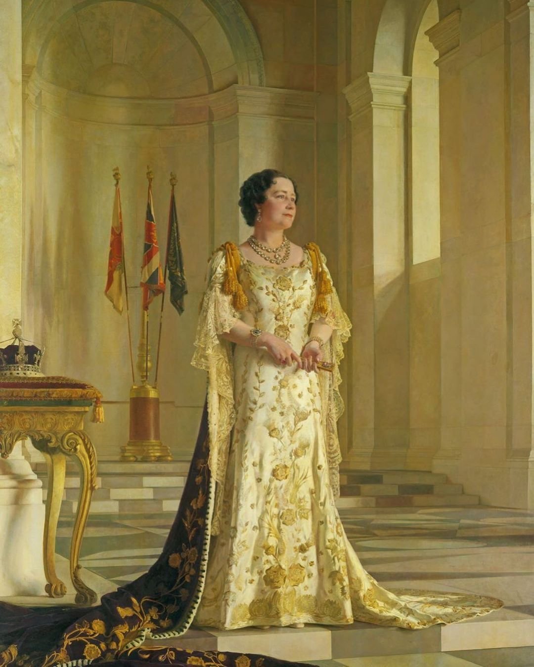 Попаднах на този красив портрет на кралицата майка. Тук е с дрехите от коронацията си, а на масичката до нея е и короната и. Художникът е сър Джералд Кели. Портретът е изложен в Пурпурната стая в Уиндзор.