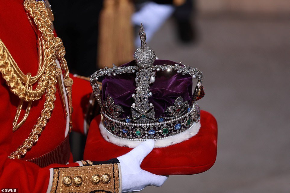 Всички се изправят, Кралицата влиза. Би трябвало да е с ето тази корона:
