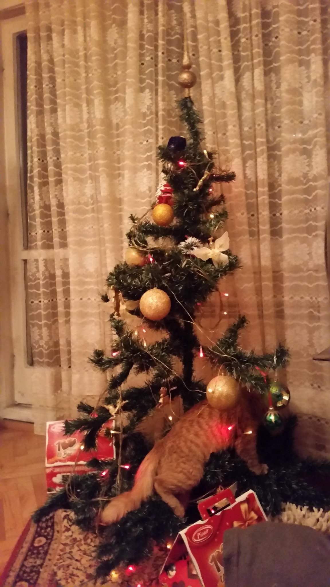 И да допълня с нещо също важно: не слагайте гирлянди на елхите си! Котките много често отхапват от тях, и после се налага операция, за да се вади чуждо тяло от стомаха. Питайте ветовете, да ви кажат колко често им се налагат такива операции по Коледа. И слагайте пластмасови украшения, защото от стъклените маците могат да се наранят!