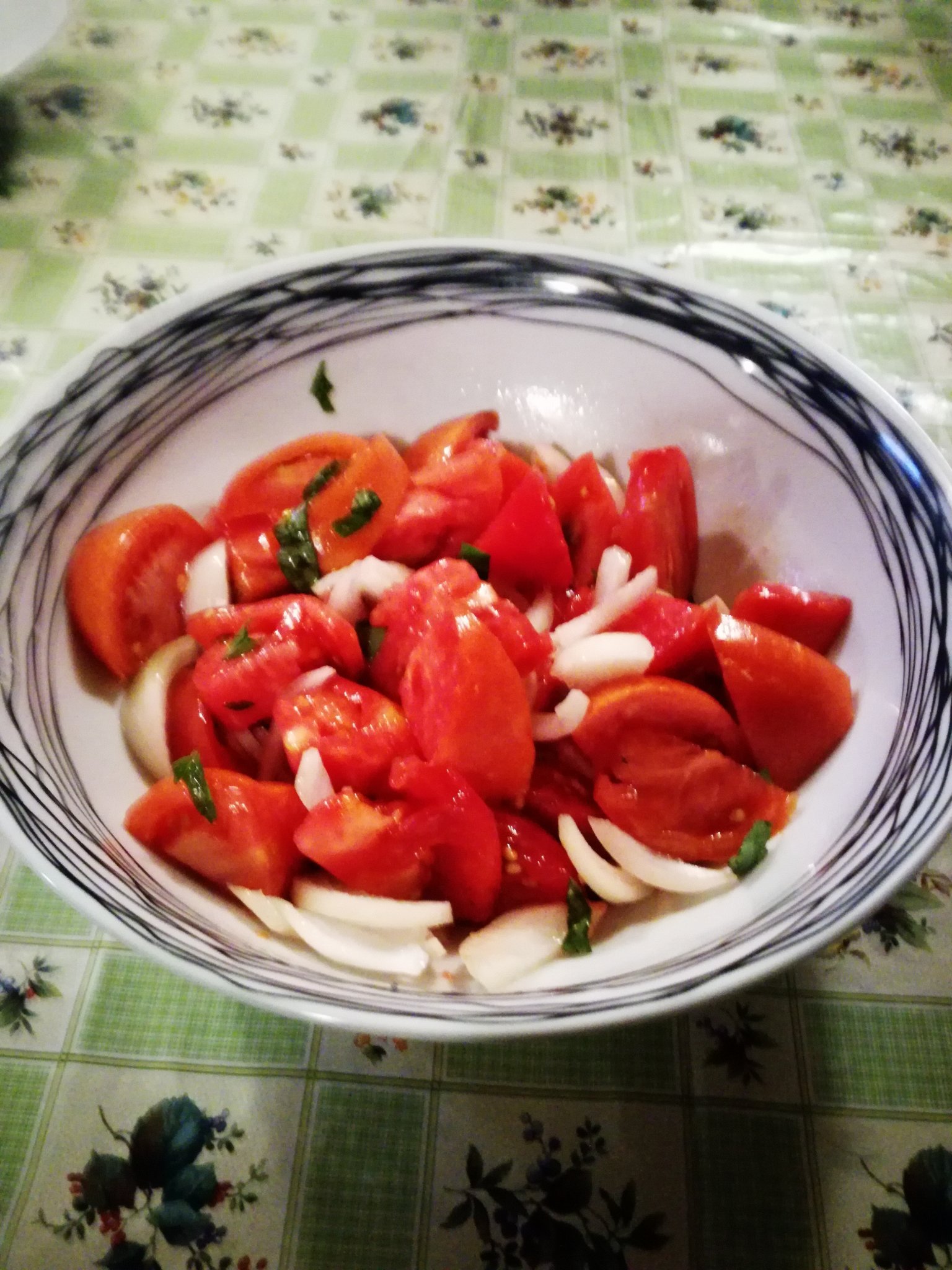 От снощи- салата от домати-лук-босилек,пържени картофи и пилешки пържоли на скара.
