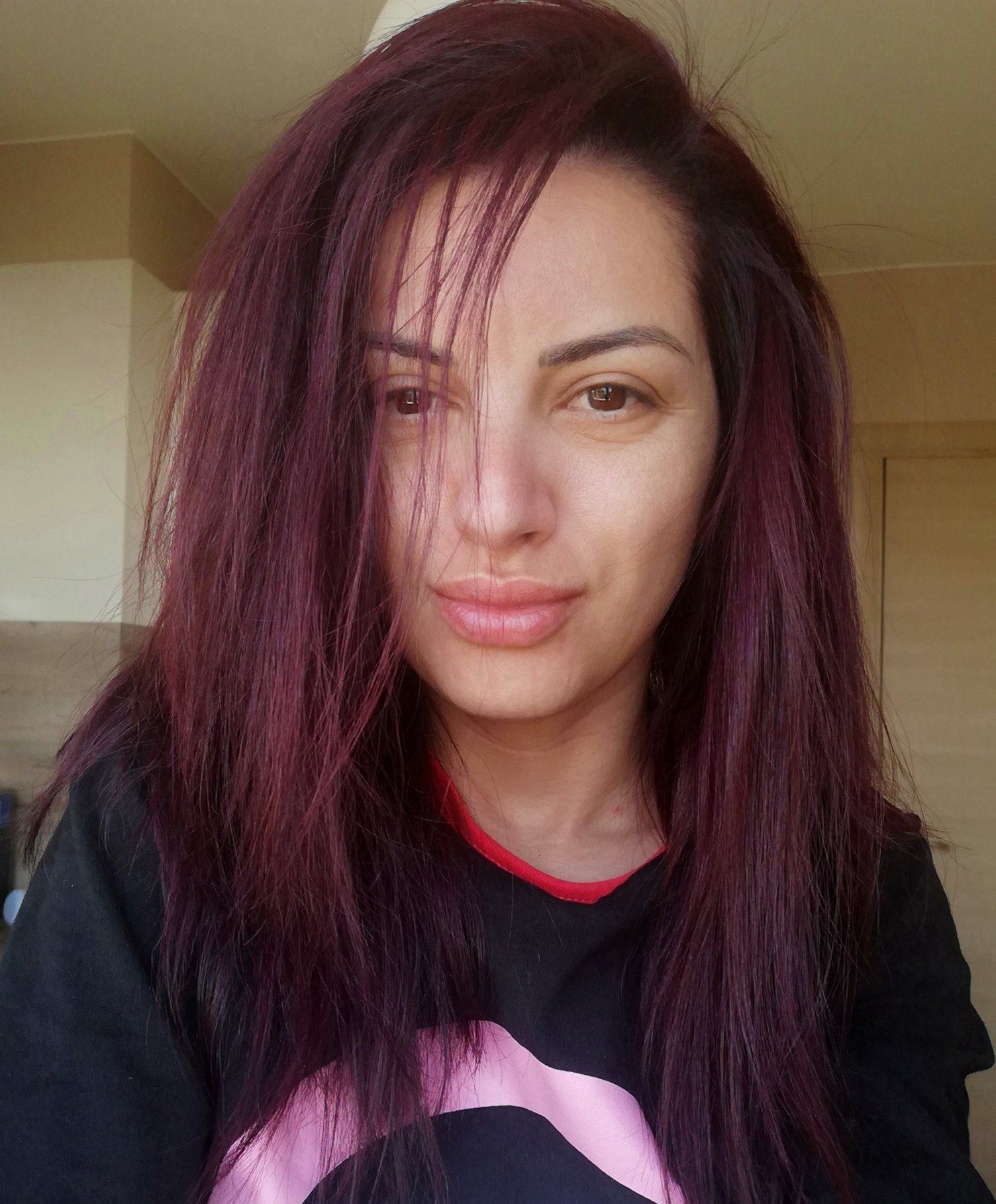 На живо косата ми е червеникава с лилав отенък. Едвам ми стигна, като количество,  обаче. Фризьорът ми ми каза другия път да сложа 2 бои от аметиста и 1/4 от тройката, заради белите коси.