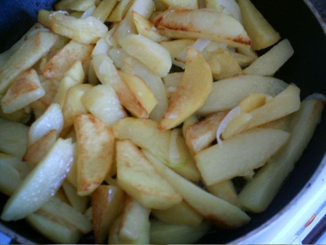 Задушавам ги в тефлонов тиган с похлупак, с малко олио+масло, на бавен огън, често разбърквам, а към края поръсвам с малко червен пипер. Картофите също така трябва да са нарязани на тънко.