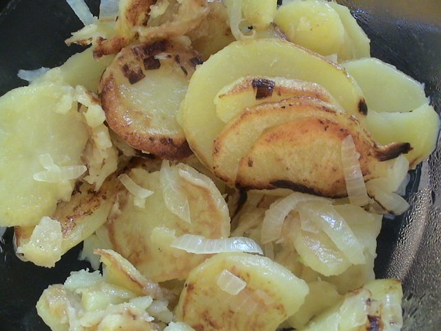 За да приготвите хрупкави картофи, нарежете ги на полумесеци и ги задушете в тиган с незалепващо покритие с малко мазнина. Когато почти са готови, добавете нарязан лук и продължете да готвите още няколко минути. Маслото може да се добави накрая. За да предотвратите разкашкване, разбърквайте по-рядко. Рецептата може да бъде адаптирана с различни подправки или съставки като чесън, гъби, соев сос, яйца и др., за да се подобри вкусът. Ключът към приготвянето на хрупкави картофи е да не прекалявате с мазнината; ако пържите картофите в тиган с малко количество мазнина, те могат едновременно да се запържат и задушат. Използвайки тиган с незалепващо покритие също помага за предотвратяване на прегаряне и осигуряване на равномерно готвене.