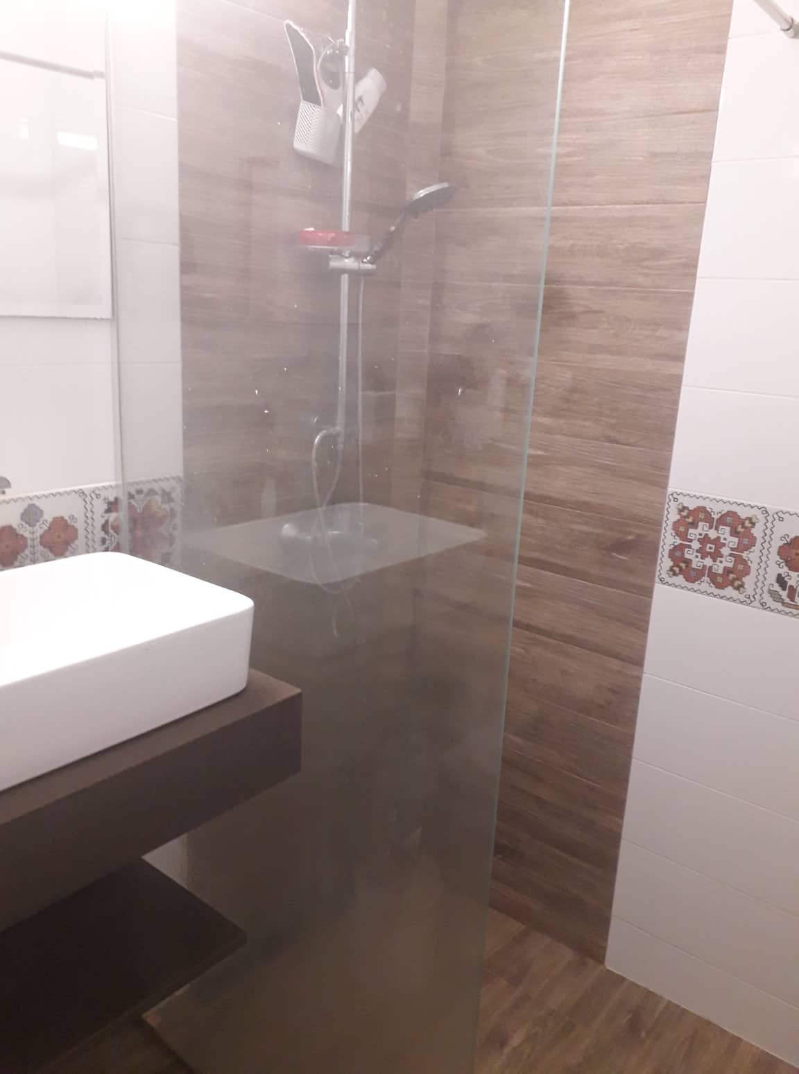 80 см. На нас ни е много малка банята, та нямахме много избор. Но не е тясно, дори и за ММ, който не е малък. И самото стъкло е на 80 см. Но стъкла има и по-големи.