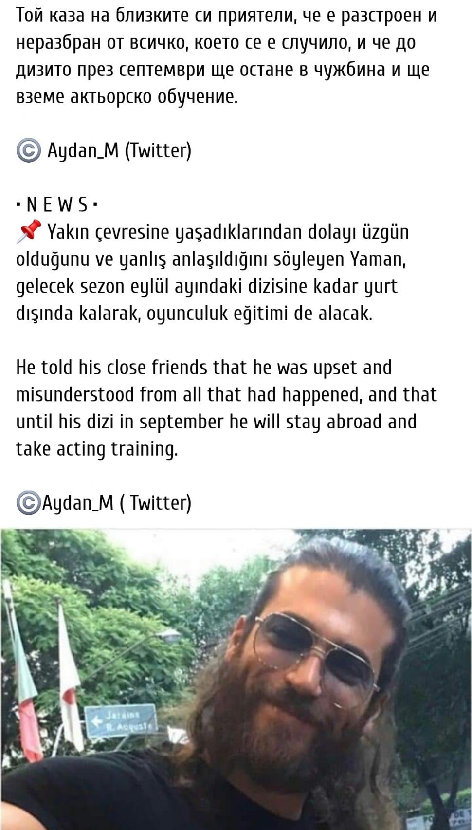 Това, което Нина е публикувала и аз го четох в ТТ. Джан се чувствал много неразбран и наранен от цялата тази истерия, която се случи и най вероятно ще е извън Турция до началото на сериала му.
