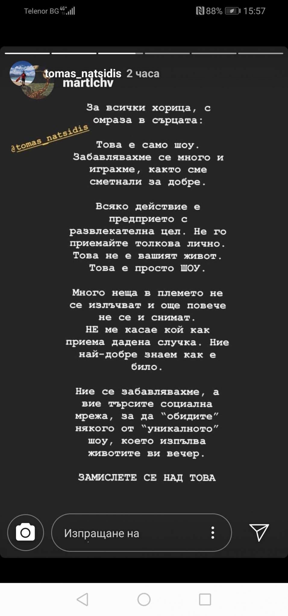 Тоя пък льопър, хора с омраза в сърцето, изпълвало ни шоуто вечерите. Ми не бе господине, аз си пускам вечер телевизора, за да се насладя на предаване, което е за хора спортисти, със силен дух и физика, които преодоляват препятствия и се борят не само за наградата, а и със себе си. Това шоу не ми изпълва вечерите, по-скоро ми се иска да се заредя с позитивност, да се възхитя на такъв тип хора, щото аз не съм такава, да се вдъхновя. И какво се оказва, гледам шоу за палячовци. Мускули, подплътени от интриги и поведение, което е срам, като пример за децата и тийновете, които гледат. Срам за мъжете, които не се занимават с игрички и надцакване, а уважават жените и си държат на думата. Срам, че съществуват толкова злобни, недорасли, мръсни в душите си мъже. Всеки упрек, всяка критика си я заслужавате. Само вие срам нямате, да замълчите, да се извините за гнусното си поведение и търкане на диваните, докато жени ви изнасят битките, а вие ги унижавате. Но съм сигурна, че никога такива хора няма да си отворят очите и да разберат, какво са направили. Ще си останат емоционално и интелектуално оскатени за цял живот.