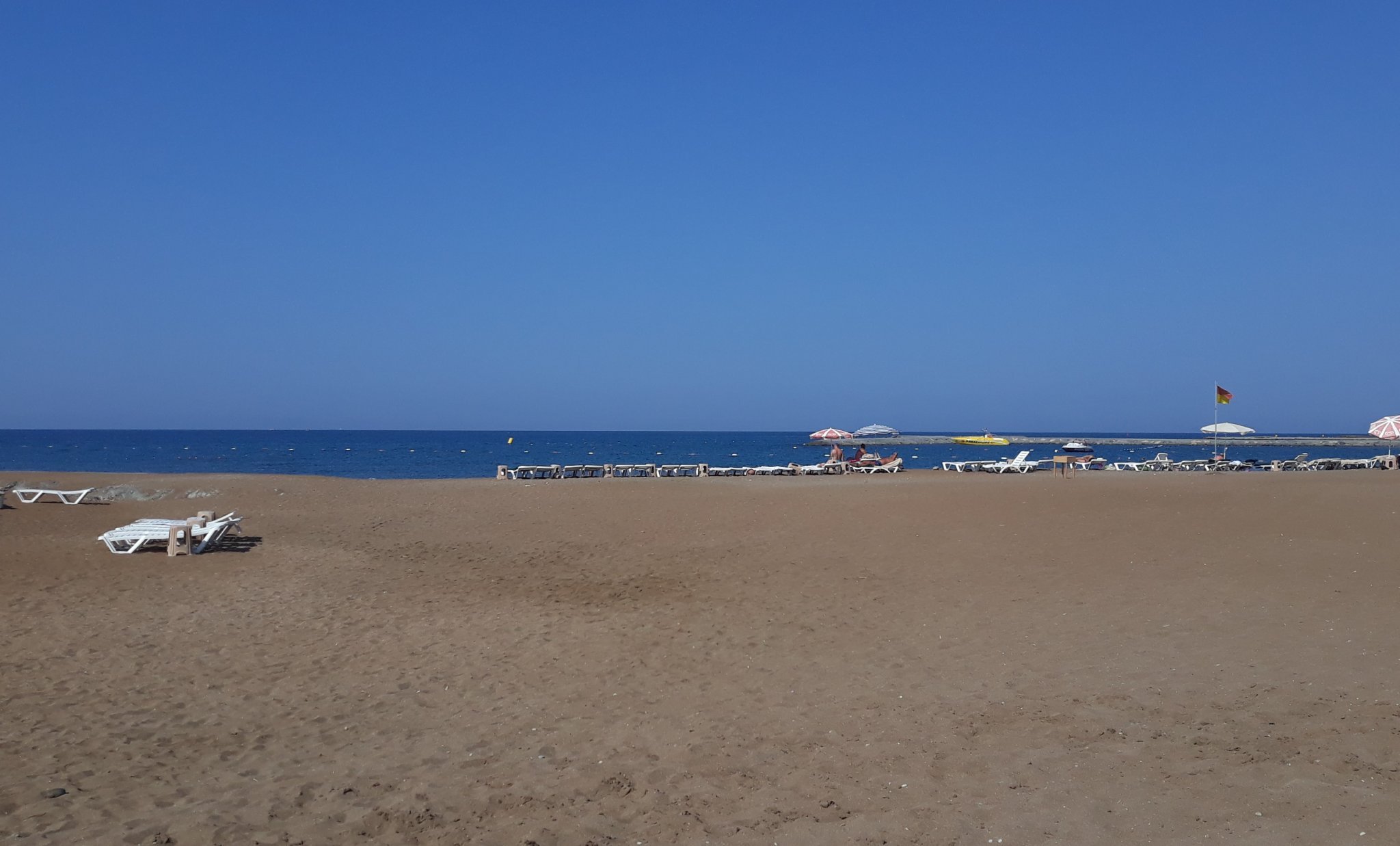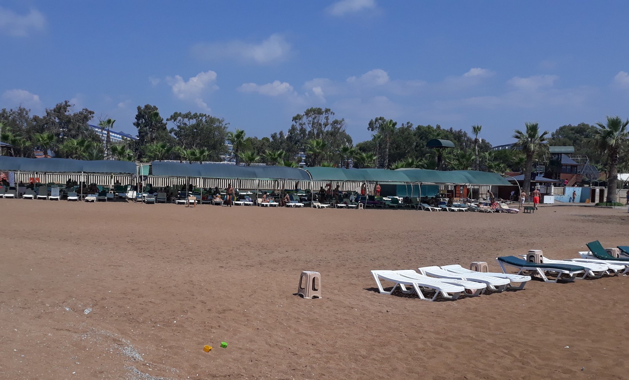 Качвам снимка от една малка част от плажа на Ефталиите. От чадърите под тентите до водата има 70 крачки . Това отпред са няколко издърпани шезлонги от туристи, които искат да са до водата.