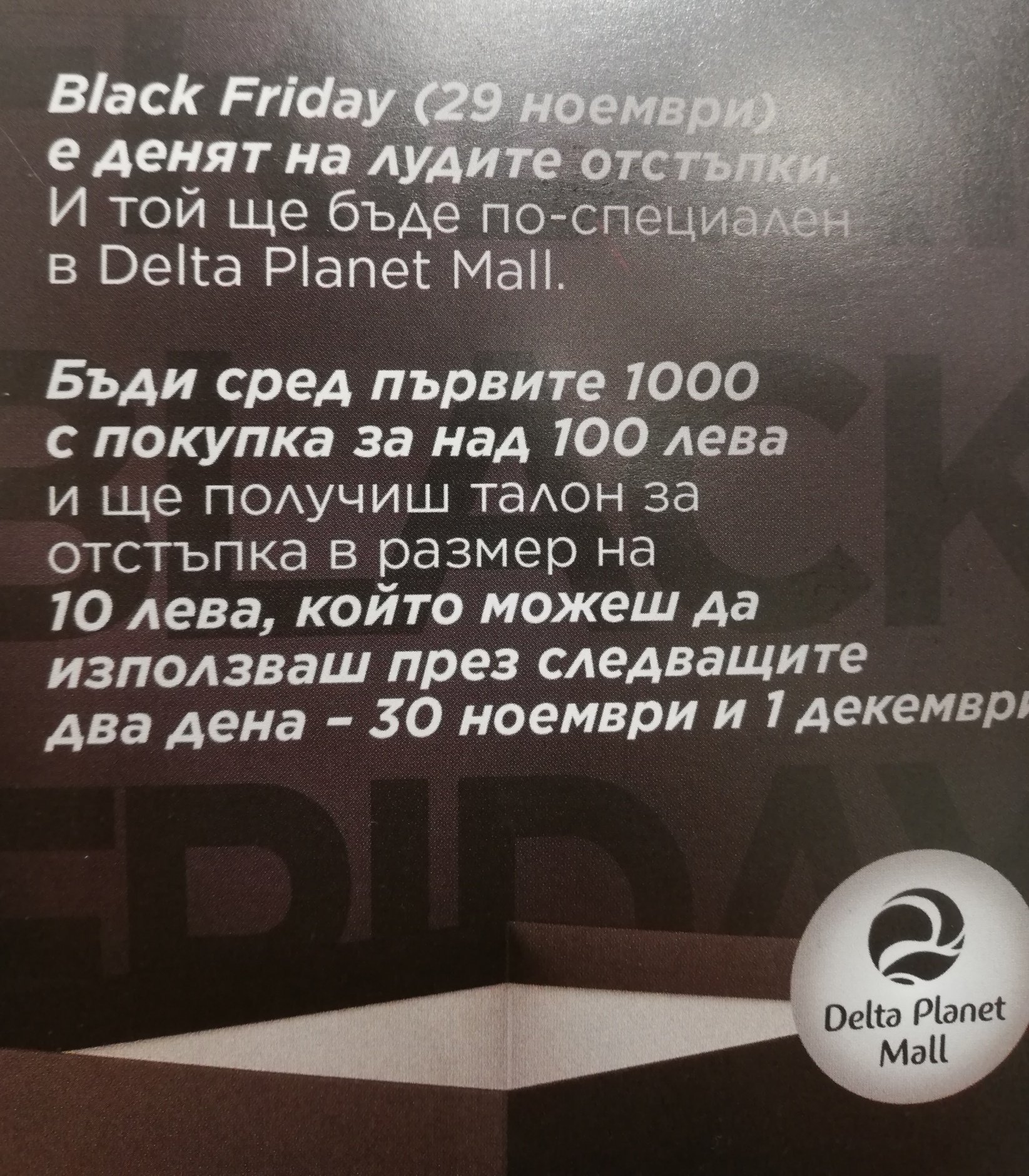 В Мега МОЛ, София, Люлин, ще има намаление за черен петък в ДМ - имаше плакат.