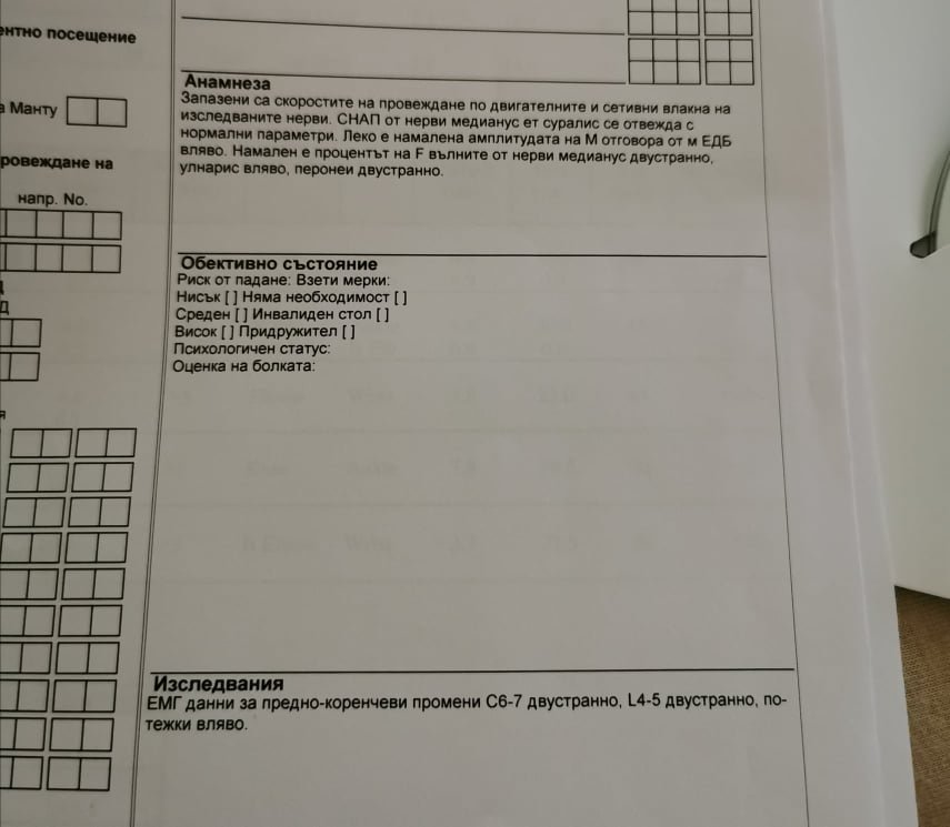 Здравейте, хора! Видях, че тук си пишете не само за дискови хернии и реших да се включа, с надеждата да ми препоръчате лекар в София. Ще се постарая да дам кратко описание на проблема. Преди ДОСТА време всичко започна с периодична болка в лявата плешка. Постепенно тя премина към главата, после ръката, а накрая и крака. Според ЛЛ - плексит, нямало какво да се направи и си стоях така. В последствие минах през двама невролози, първият беше.. без коментар. Вторият се прежали да ми направи снимки и се видя, че целият гръбнак от двете страни е ошипен. Диагноза и по-специално лечение - тц. До момента, в който един ден започнаха да ми изтръпват двете ръце и двата крака. Изпаднах в ужас съответно и си запазих час в Токуда, при д-р Тончева. Минах ЕМГ и ЯМР, от които ще включа резултатите. Откриха се, според нея, дребни проблеми, които не обяснявали болката и изтръпването. И съм до никъде.. Сега пак има изтръпване, болката си е .. все така Simple Smile