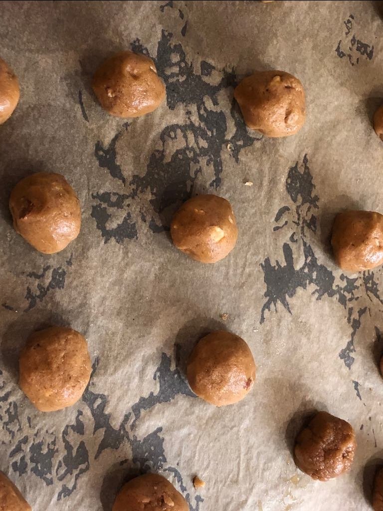 Всички други инструкции в рецептата са безсмислени, тип, да натискаш топчето смес през прозрачно фолио, за да не се цапаш и да не ти залепва. Ако е добре смесено, няма да се случи нито едно от двете. Или пък как да натрошиш орехи...