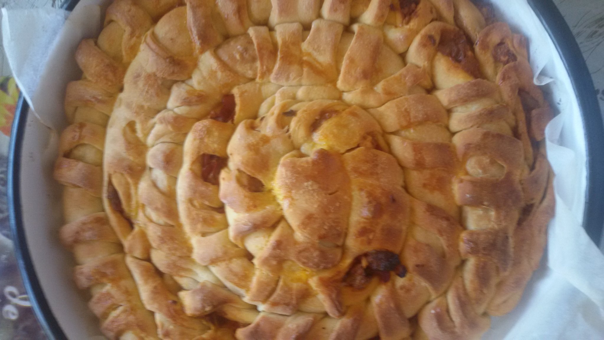 Дори не знам как се казва, но е нещо като разточен тутманик с пънеж от праз лук, кромид лук, червена чуша, доматена паста и сирене. Рецептата е от You Tube. Правеше го една туркиня.