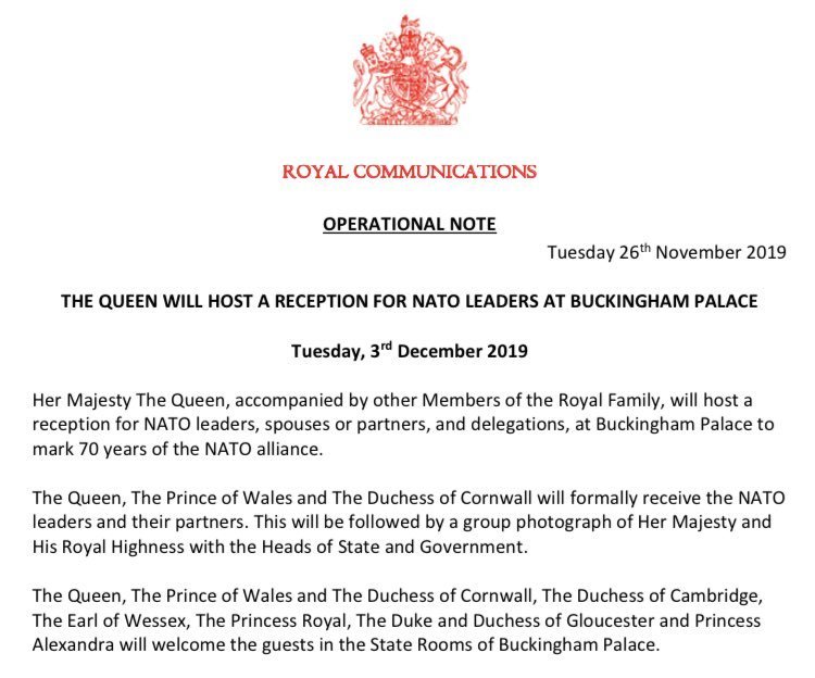 На официалната вечеря за НАТО ще ходят Кралицата, Чарлз, Камила, Кейт, Ан и Глочестър. Тя ли беше на 3 декември?