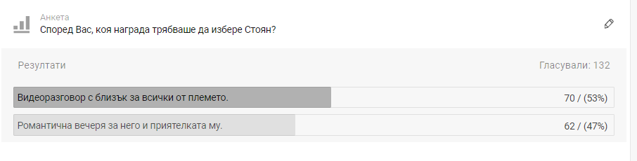 Аз ако съм на Юлиян на мястото ако има някаква последна игра за територия и тия довечера саботират нарочно, дори няма да участвам. За последно да ги прати в колибата, за да видят откъде изгрява слънцето нагледно. Нали Радка искаше женска игра само? Досега по мой спомен нито Юлиян, нито Пламен са пропускали игра-за каквото и да е. Я да седнат отстрани и да ги оставят да се доказват, ама на териториална. Да спрат да лъщят тези двете, че облъчване получих през тивито.