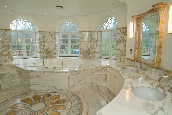 Естествено, че и големите бани могат да бъдат изцяло  с плочки или плочи от естествени камъни някакви. Въпрос на желание и пари.