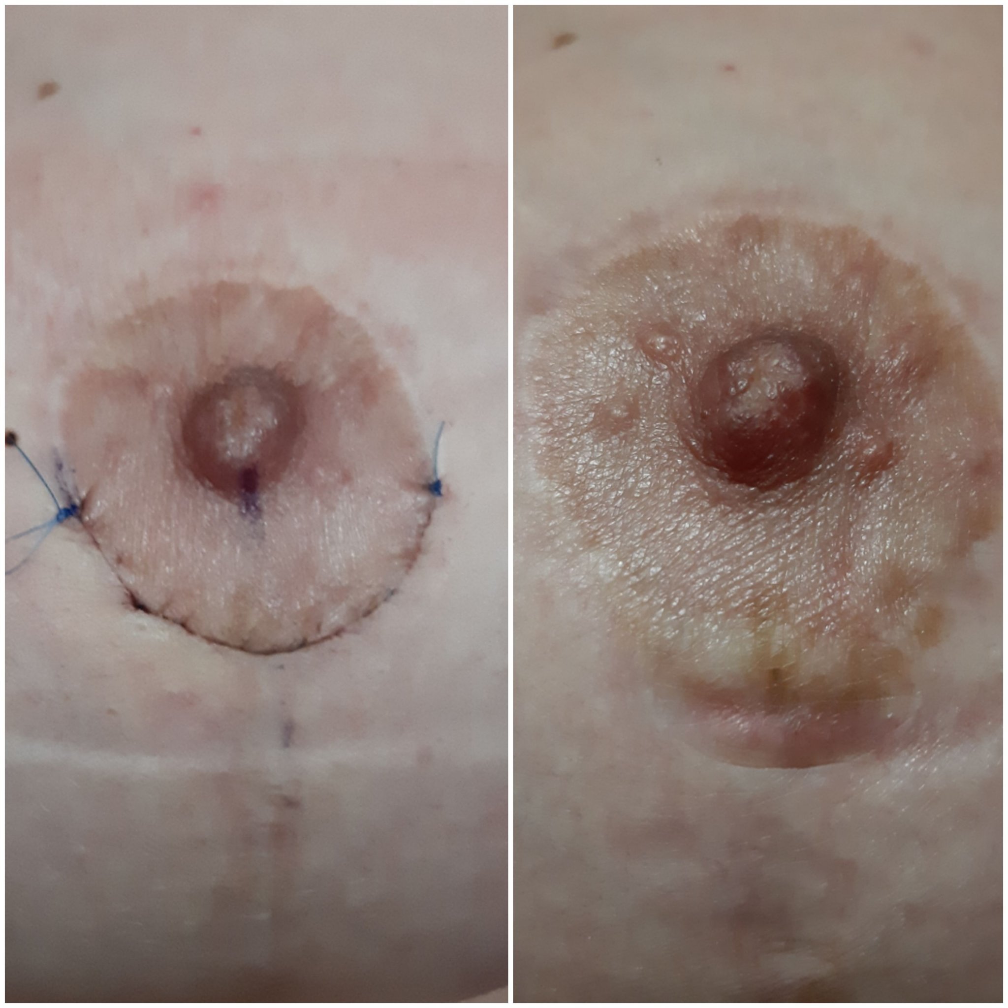 Ето снимка преди и веднага след корекцията. Може да видиш разреза около цялата ареола как е.