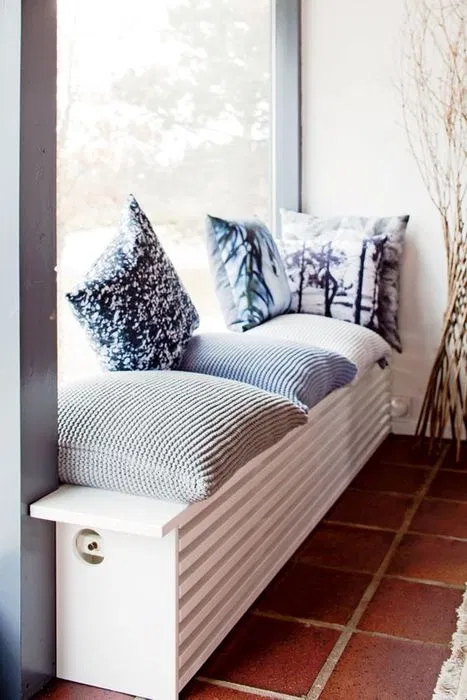 Единствения друг вариант в случая би бил много тесен вертикален радиатор между прозореца и дивана, но са значително по-скъпи, не толкова ефективни и не ги слагат стандартно в строителството. (не като тези с напречни тръбички за баня, има едни като плочи...)