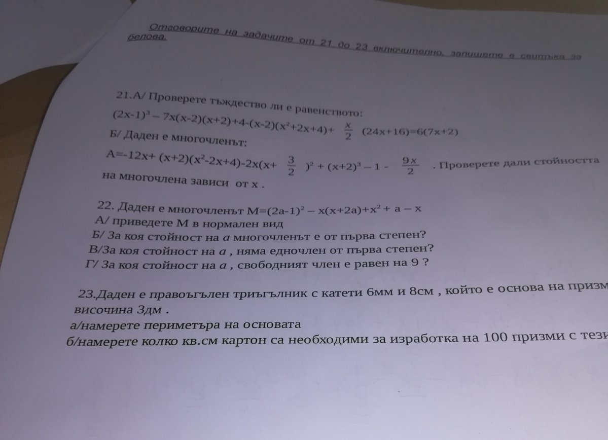 Не са им дали условията на децата. Синът ми беше с групата в 9ч. и беше разочарован от изпита. Имало е сгрешени отговори, които са корегирани в движение. Неточности в условията. Той е снимал само втората част, защото нещо бучеше и се възмущаваше на 22-ра задача. На 23 зад. също има объркани мерни единици в условието.