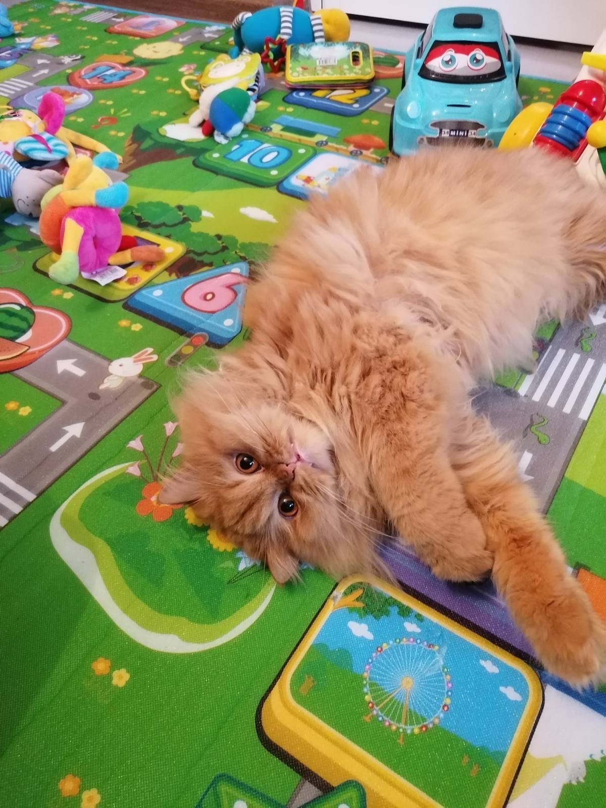 Има си негови играчки и топчета, но най-много обича топчето от една играчка на бебето . Днес даже събори играчката та да падне топчето и го гони навсякъде из вкъщи. Има и събирателен пункт на топчета и ъгълчета от первазките 😁
