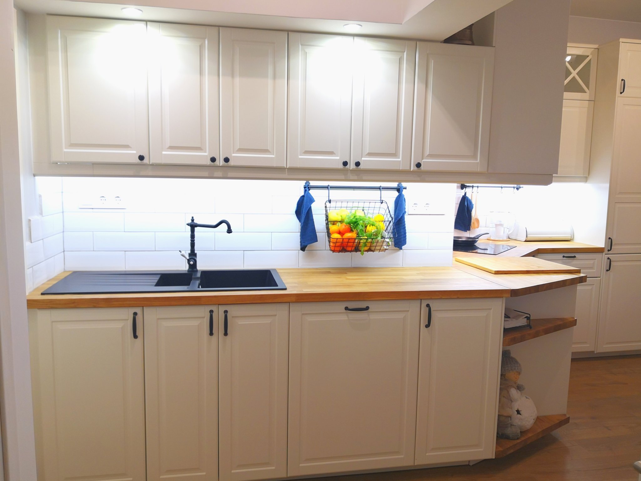 Друг вариант е да намериш шкаф от дърво, който да се върже с дървените плотове на масата и кухнята. Но бял не, по мое мнение.