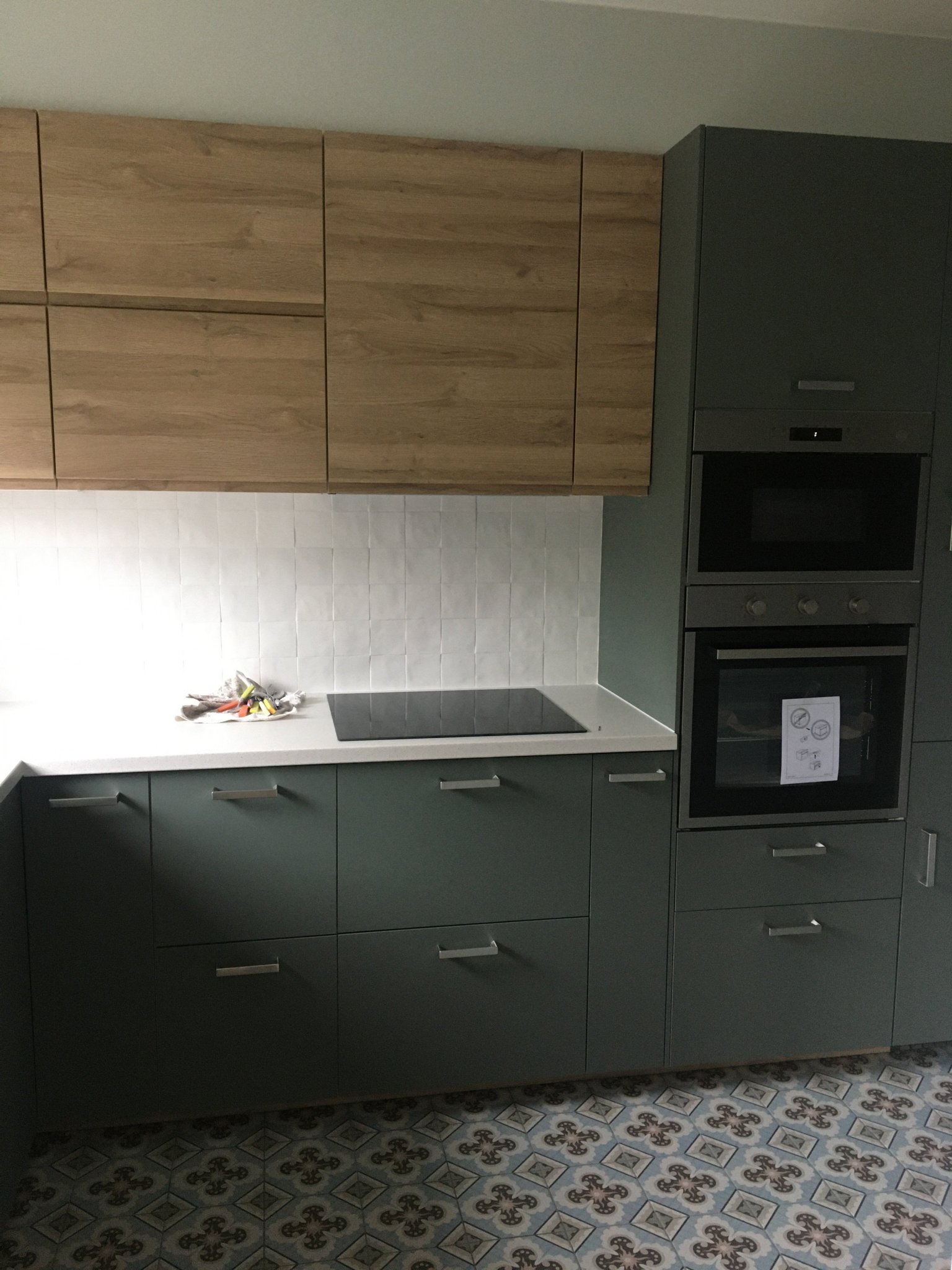 Тази кухня без плот, мивка, смесител, дръжки и уреди е 3800лв. Размера й е 3,15х 1,80. Сглобена е, но е насипна и още не мога да я покажа готова. Вратите са Savedal. Долните шкафове са чекмеджета с пълно изтегляне. без този под мивката. До нея в ляво е съдомиялна. Двата ъглови шкафа не са с въртящи механизми, а са с рафтове, .