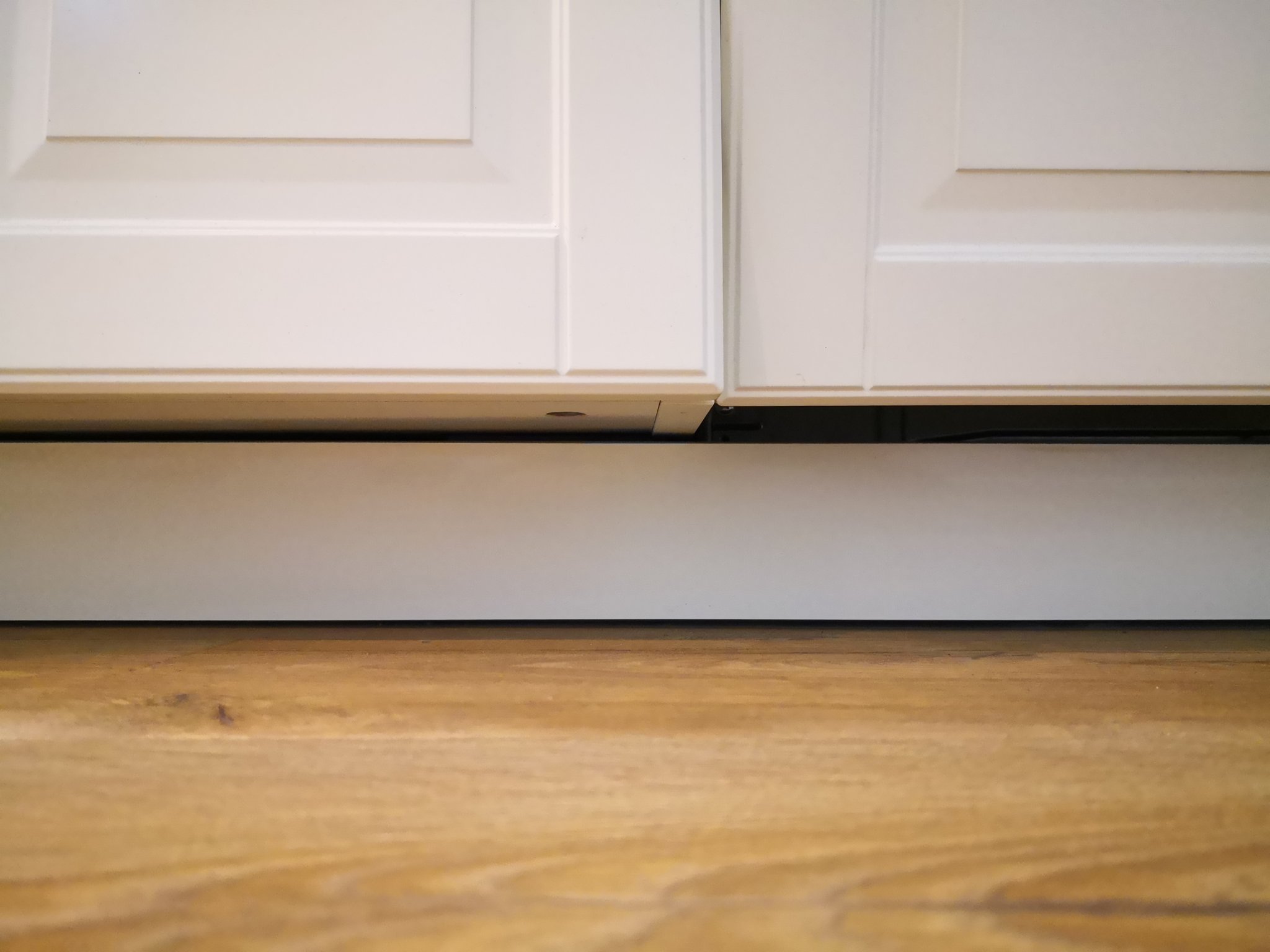 Нашият плот е на височина 92,5 см до горния ръб. Цокълът отдолу не стига до горе, до долната страна на шкафовете, а има малък луфт. Но той изобщо не се вижда. Легнах на пода за тази снимка.