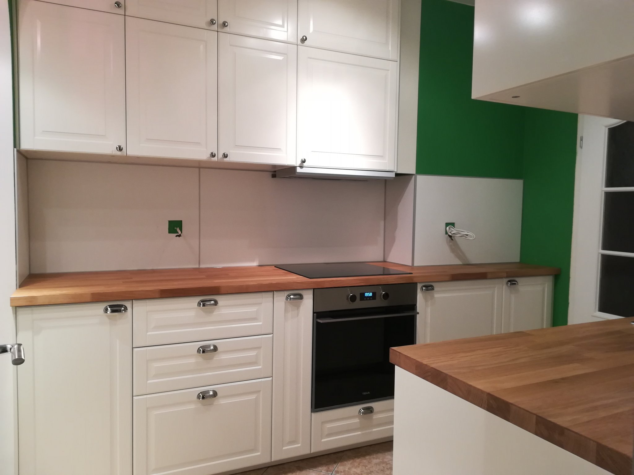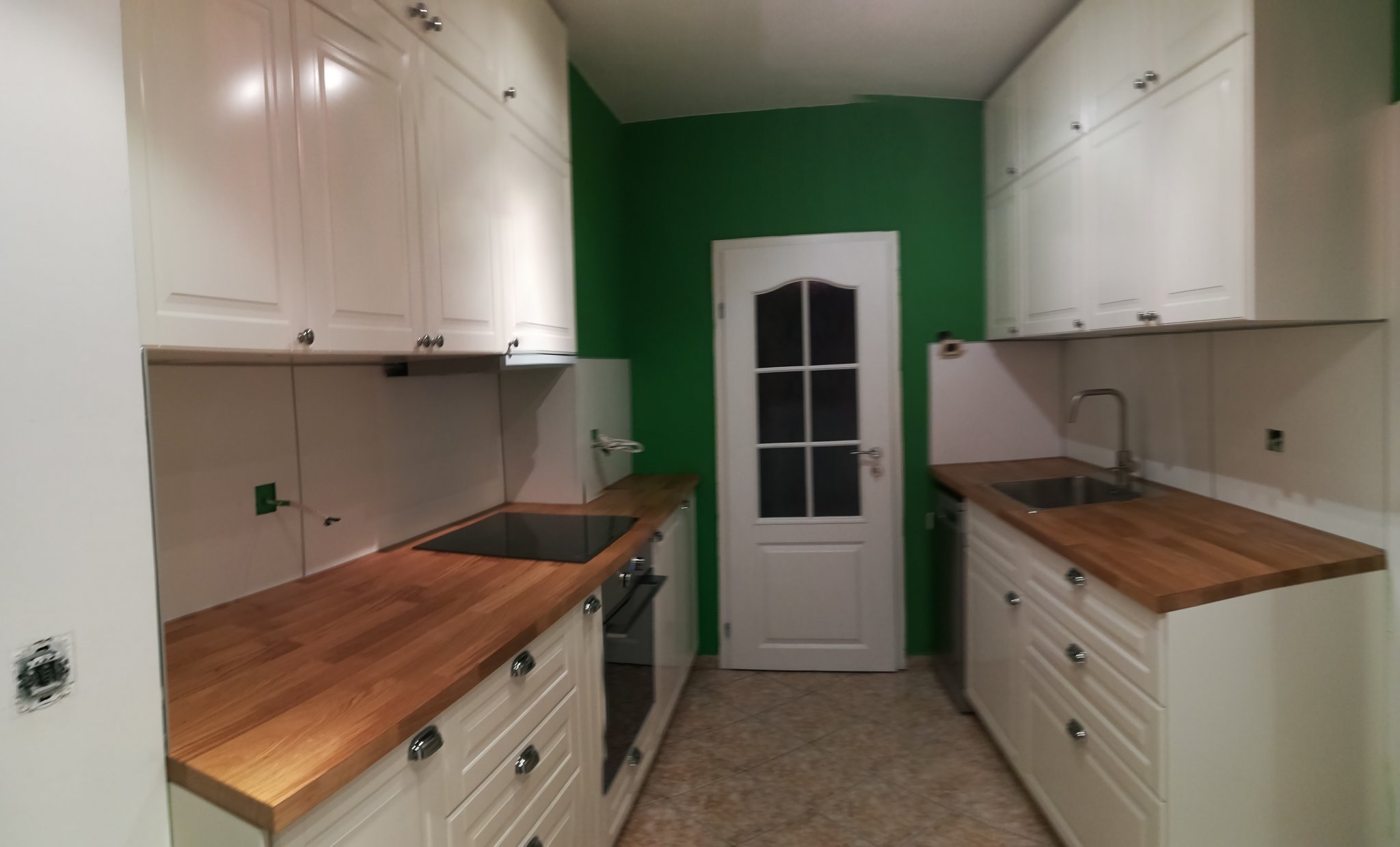 Извинявам се за лошата светлина. Останаха контактите само да се поставят и снимката е веднага след монтажа на кухнята: