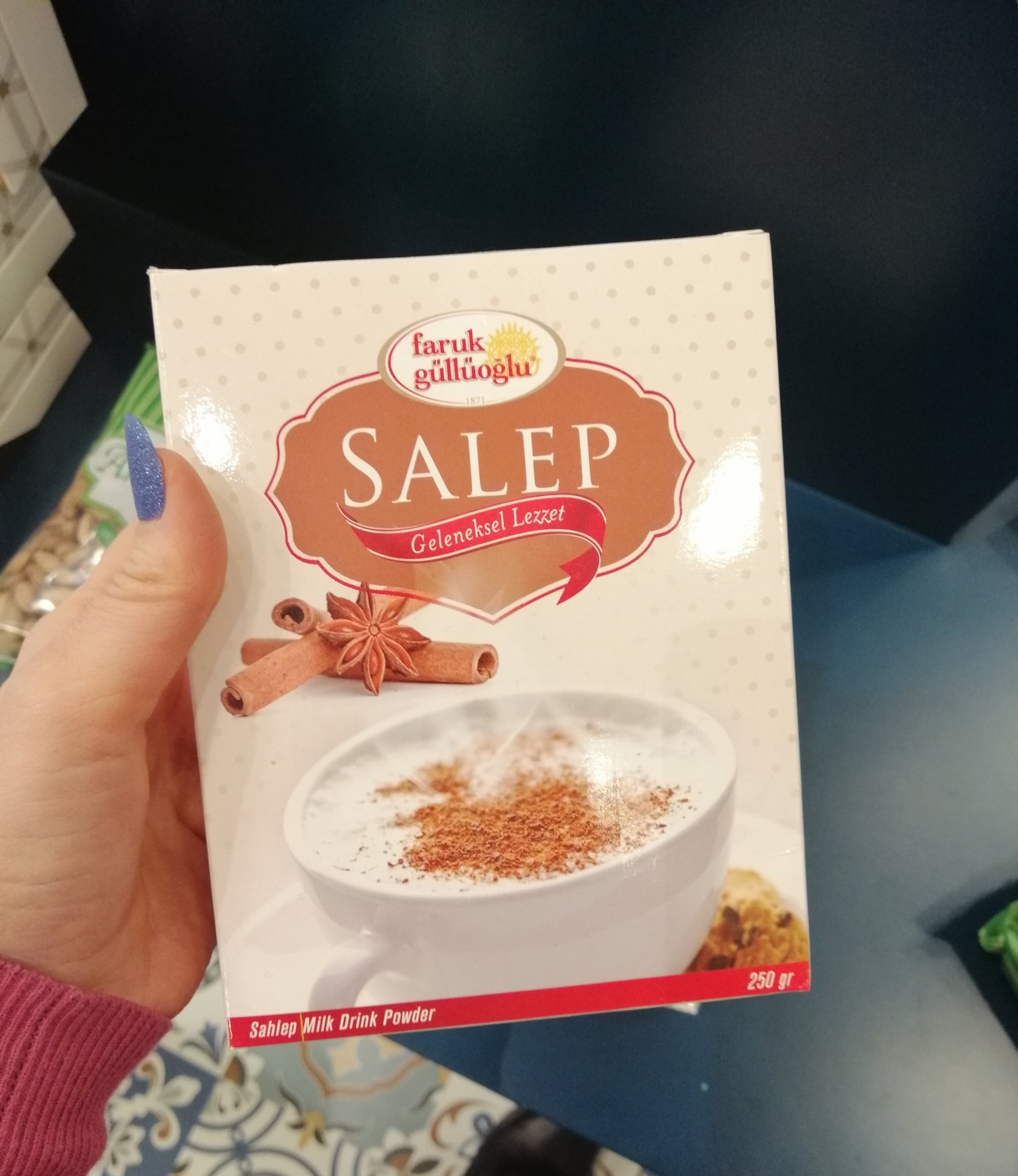 А кутията във Faruk Gulluoglu струва 15 лири. Питах как се прави, но момичето ми обясняваше на турски и доколкото разбрах за 2 чаши, се слагат 4 чаени лъжици салеп. Гледам на пакета сега пише - 2 лъжички за порция, така че съм вдянала правилно.