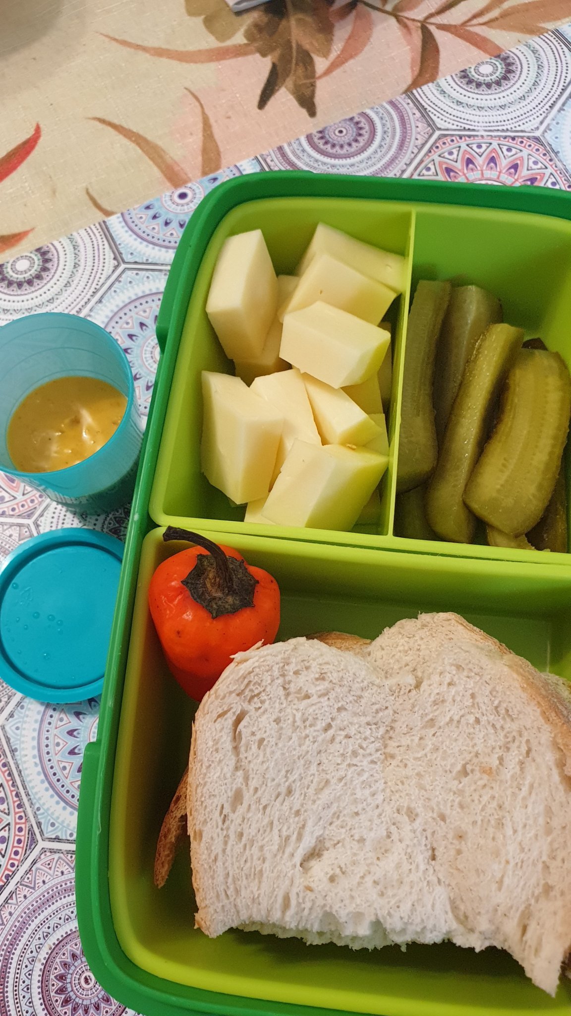 Кутийката ми е скучна, но ще я ям на път! Хляб, кашкавал, сос хавай, кисели краставички! Даже и кафето взех в контейнерче...