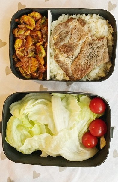 Обяд: брюкселско зеле с гъби и дом сос, ориз с масло и вратна пържолка и салата с айсберг и чери домати