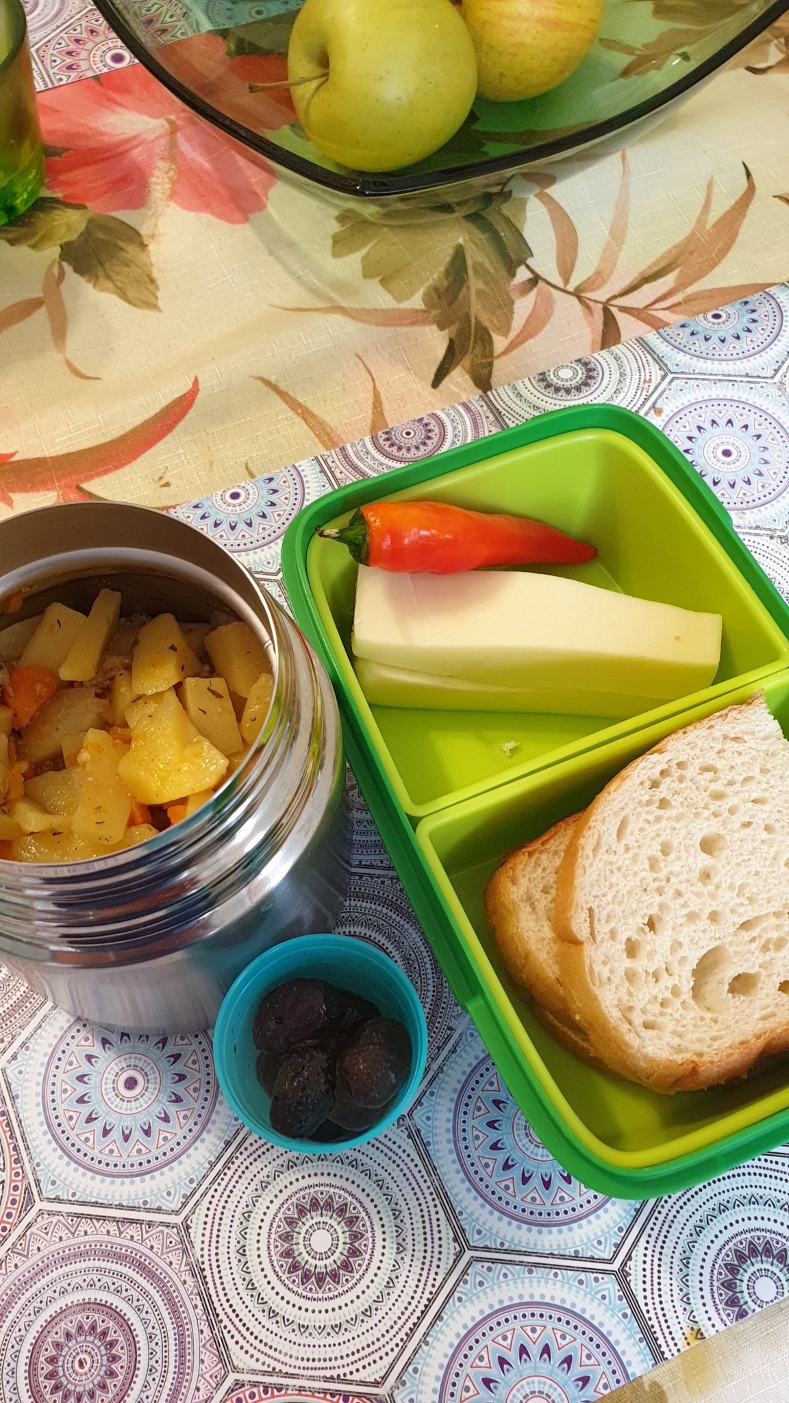 Не мога да снимам, но чери домати и кисели краставички с пилешки хапки и картофено пюре. Последното го правя със зехтин, а не с масло и се запазва по-добре като е изстинало.